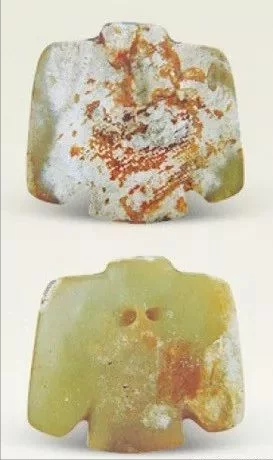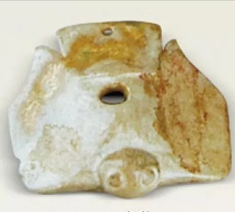 鹰形佩(图1)虢季墓出土。是佩、璜、玦组合发饰中的一件,出土时位于墓主脑后。长5.3厘米,最厚1.4厘米。青玉,浅豆青色,大部分受沁呈灰白色。整体近方形,首部浑圆微凸,圆形双目,嘴为钩形,双翅展开作欲飞状,胸腹微鼓,尾平齐较宽,背面素面。背面胸部有一横向象鼻穿孔,中心和尾部各有一透穿孔。此鹰和牛河梁红山文化遗址出土玉器中的鹰形佩(图5)特征基本一致,但中心和尾部圆孔系西周时期添加上的。
