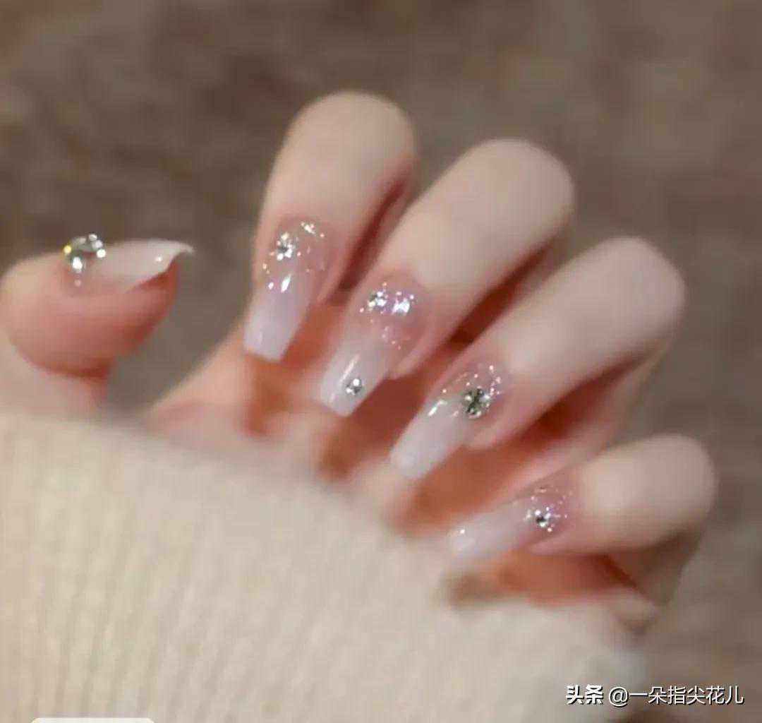 第五款:果冻白色搭配裸粉色腮红晕染,点缀铂金碎和拉丝胶。