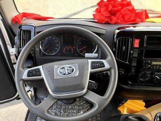 驾驶室内部给人的感觉还是非常舒服,四副式方向盘带多功能按钮,方向盘是解放重卡上的造型。后面的仪表盘对称设计,中间带有液晶显示屏,左右两边的仪表外部带有银色的包围圈,观察起来非常的清晰。