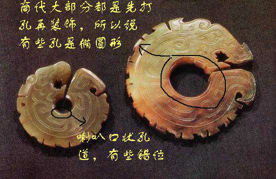 商代玉器上的孔多呈单向马蹄形、喇叭口形,其对钻孔常有错位、留台现象,早期还好一些,越往中晚期越是如此。