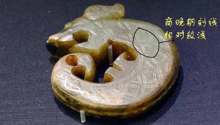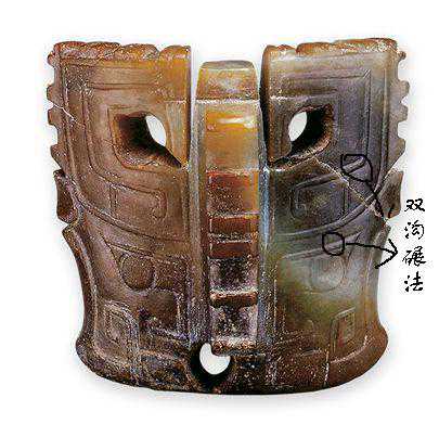 商代的阴刻线刚劲有力,有"折铁线"之称,早期砣线较深,显得刚劲有力,到了晚期则较浅,略显粗糙,仔细观察就会发现这些阴线边上有许多的毛刺,略显粗糙,这些都是由于工具不利所造成的,无论是早期还是晚期,虽然砣线交接处会有刻痕间断、刻痕起峰变浅的现象,但是砣线的深浅程度,如出一人之手,非常规范。