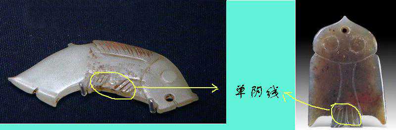 一面坡,商代中期开始出现,到了西周开始流行起来,就是将阴线一侧的地子磨成斜面,使隐起阳纹更加明显,但因其斜面略带弧度,不及西周时期的宽直(要注意的是这种砣线法在商晚大量出现,且多用来表示卷曲的尾巴或者卷曲的兽角、龙角、羽毛纹、鱼鳞纹等,这在商早期是很少见的)。