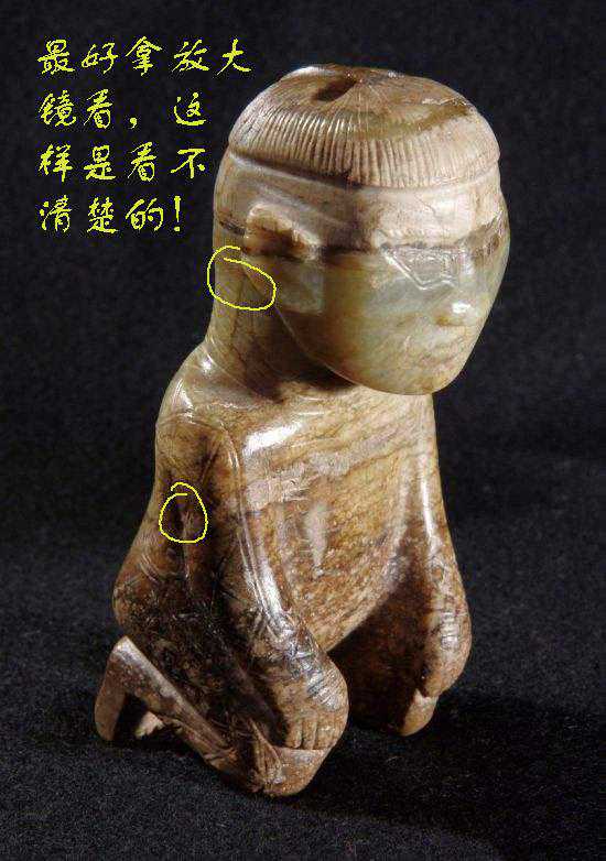 商代的玉器抛光全靠手工,可以利用兽皮、丝织物等物品,配合极细的解玉砂手工抛光,故在玉器表面会留下不规则的直线型抛光痕迹,但这种抛光线痕迹不平行,粗细深浅也不均匀,偶尔出现很粗的划痕,尤其是在一些复杂的表面,如嘴下、耳后、转折处,通常可见不均匀的直线划痕和相互交织的现象。