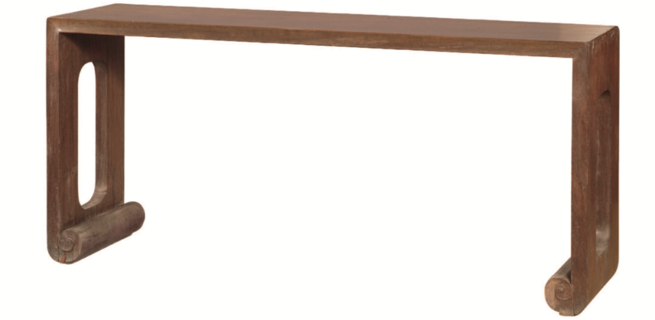 几案乃是文士书斋中的基本家具。文震亨《长物志》云:“天然几以文木,如花梨、铁梨、香楠等木为之,第以阔大为贵,长不可过八尺,厚不可过五寸,飞角处不可太尖,须平圆,乃古式。”铁梨,即铁力木。这件条几,正是用铁力木制作。比起花梨木,铁力木虽然材质不求贵重,但质料性强,制作大件家具,颇有厚重之感。屈大均《广东新语》言铁力木“力坚质重”,历千百年不坏,木质起初为黄色,用久之后呈铁黑色,因此自然有一种岁月摩挲的古韵。观其式样,恰如文震亨所言,面板与板足以闷榫衔接,抹去棱角,做了平圆的处理。显得颇为舒朗。