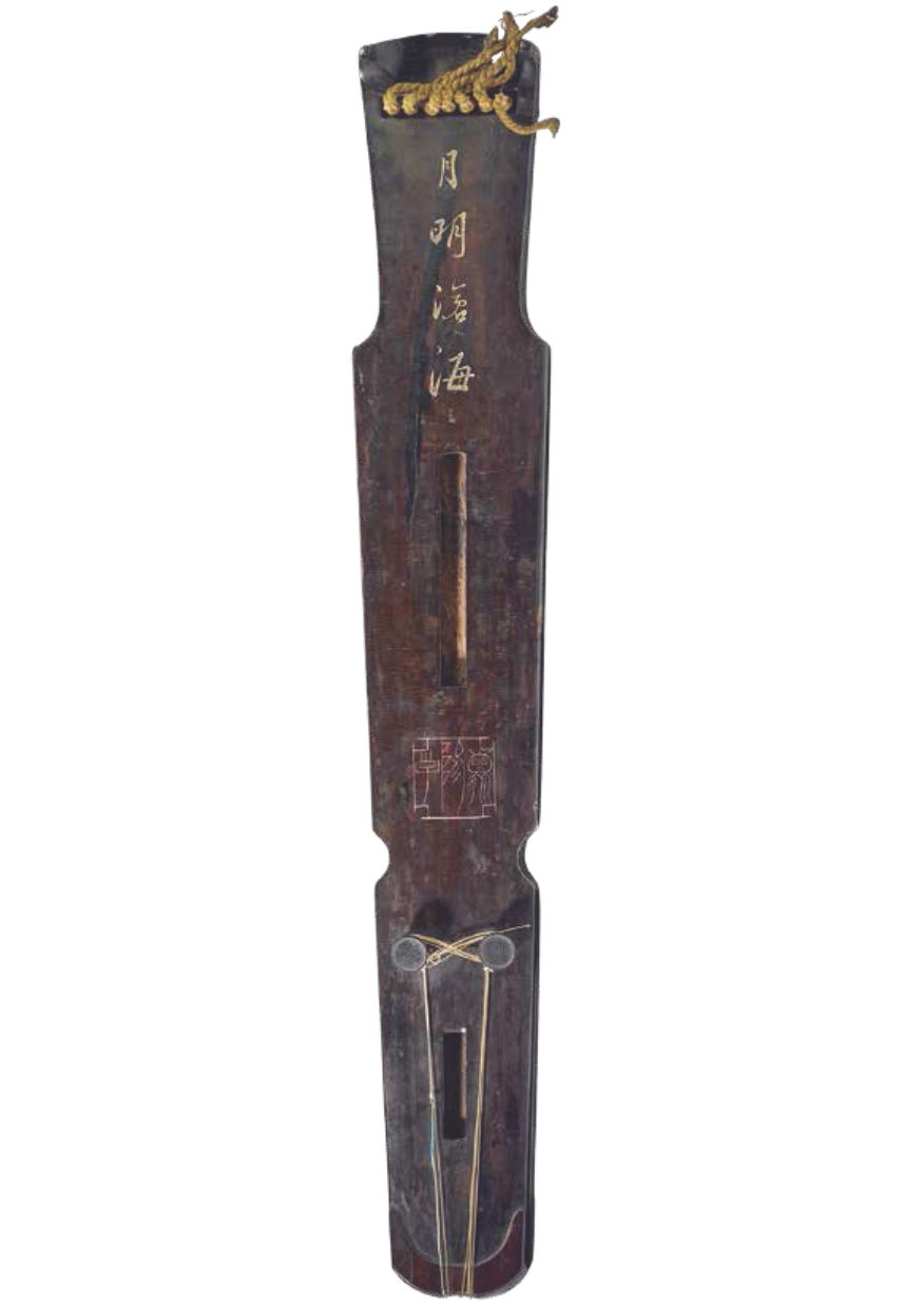 这张琴为伏羲氏琴,桐木斫成。历年日久,黑色漆光已然褪尽,表面可见梅花断纹,完全符合文震亨笔下文人雅士所贵的古琴。琴背龙池上方阴刻填金行书“月明沧海”,是为琴名。但这张琴最引人瞩目之处,在于其琴背龙池下方阴刻的篆书钤印“龙阳子”三字,以及琴池内阴刻楷书“至正壬辰十月上旬,东海云林生监造”。至正为元朝末代皇帝元顺帝的年号,至正壬辰即至正十二年。东海云林生即元末大名鼎鼎且有怪癖的传奇画家倪瓒。至于“龙阳子”则被认为是元末明初的传奇人物冷谦。