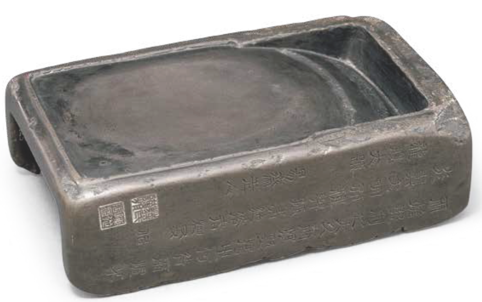 老莲,即陈老莲,也就是吴嘉骥题铭中提到的陈章侯。也就是明清之际书画家陈洪绶,老莲与章侯分别是他的号和字。陈洪绶之画作,设色古艳,以人物见长。相信每个人见过陈洪绶笔下人物画的人,都会为其夸张变异的形象所触动,与今天的漫画颇有相似之处。其风格之独特,被后世许为“力量气局,超拔磊落,在仇(英)、唐(寅)之上,盖明三百年无此笔墨”。想象陈洪绶笔下这些诡奇陆离的人物形象,是他用笔从这方砚台中蘸墨画就,也就会对这方砚台多产生一种追慕之情。陈洪绶之生平,也颇富传奇色彩,他曾游历京师,奉命临摹历代帝王像,又入内府,观看宫中藏画,但却拒绝崇祯任命他供奉内廷的旨意,于崇祯十六年南归,隐居绍兴。次年京师陷落,明朝覆灭。清兵入浙东,陈洪绶避难绍兴云门寺,削发为僧,但他性嗜酒色,曾自云:“岂能为僧,借僧活命而已。”这样一个天纵奇才、狂傲放诞之人,却在九年后,“跌坐床箦,喃喃念佛号而卒”。