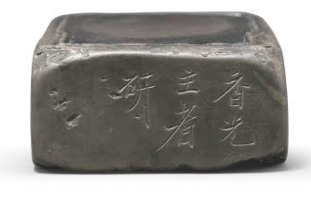 此为一方抄手砚,砚堂微陷,除铭文之外,几乎毫无雕饰。其上侧镌有行楷一行,文曰:“香光主者砚”。此“香光主者”,有学者认为是与陈洪绶同时的文坛宗主、书法家董其昌,其号“香光居士”,然而并无实据。右侧有隶书一行铭文曰:“尔惟坚,劘之亦久;尔惟默,携之何咎;尔惟不炎,翼文明而雅,与孤清绝俗者相友。似。”落款为“龙媒文题”与“易斋老人”。其背后亦有楷书铭文,云:“己未,予候补寓都门,客挟是研来,阅其题识,乃于越陈章侯故物。噫!畸人异好,赏鉴必精,亟宜珍之,以抵韩陵片石”,有“龙媒”落款。案,“龙媒”为清代诗人吴嘉骥字。