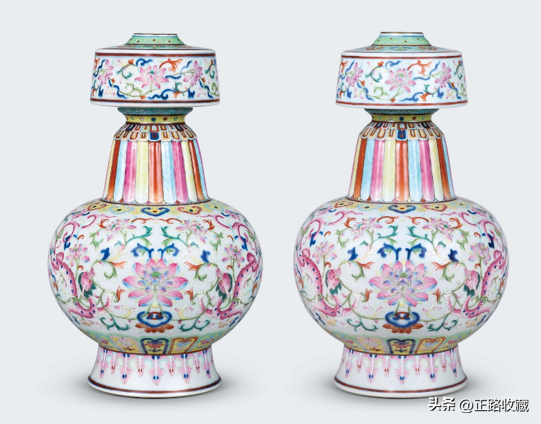 瓷质彩绘贲巴瓶为乾隆朝之首创,作为佛心天子—弘历的一份献礼而载入瓷史,除了供自身修持佛法,清宫礼佛之供之外,也作为高级御礼赏赐西藏、青海等地宗教领袖,是当时清皇室与密宗上层思想感情交流的见证,寄托双方的共同信仰。本品以代表宫廷纹样的螭龙纹描绘,且成对流传至今,值得珍视。
