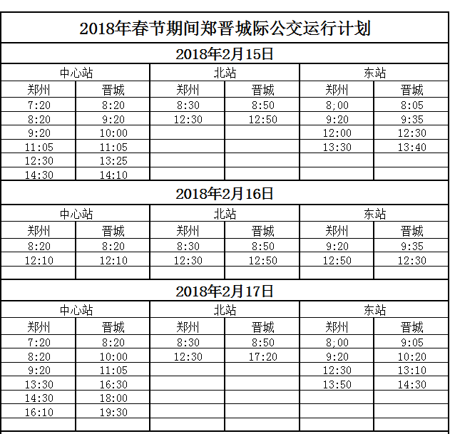 根据春节假期间郑晋两地旅客的出行需求,郑州交运集团对郑州至晋城运行班次进行调整,大年三十到初三首末班次安排如下: