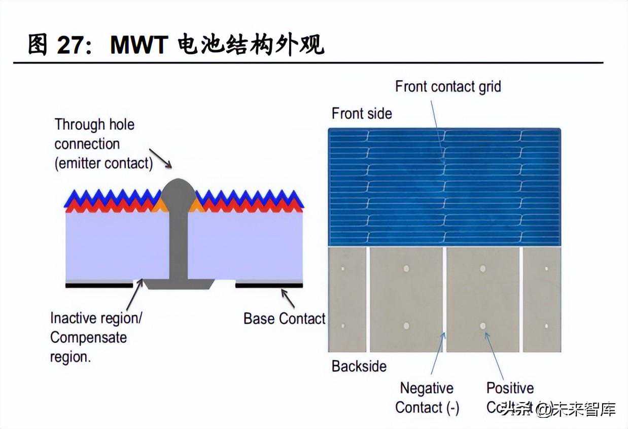 3、P型向右:结构创新或开启新升级方向,背接触电池有望异军突起PERC电池是主要以P型硅片作为衬底的电池技术代表,实际上,HJT、TOPCon等采用新兴钝化技术的电池本身也可以基于P型硅片进行开发,只是相对不太具备优势,不过也有公司在持续进行探究,如今年内隆基刷新了P型HJT电池转化效率记录。另一方面,如果在电池结构上进行创新,着眼于光学损失的降低,即使沿用PERC电池的相关钝化技术,也能够带来较好的转化效率的突破,其中最典型的一类就是将所有电极都转移至背光面的背接触(BC)电池,实际上也为P型电池下一步发展带来可能性。