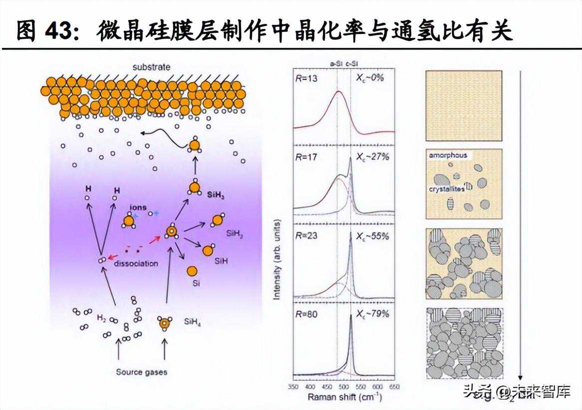 微晶硅的引入有望将HJT电池量产效率提升至新水平。目前利用氢化微晶硅(μc-Si:H)替代非晶硅作为HJT电池的膜层材料已成为一个重要的突破方向,有望将量产转换效率提升到25%以上。微晶硅材料其是由纳米晶硅(nc-Si)、非晶硅、空洞和晶粒组合而成的混合相半导体,其中纳米晶硅为直径2-10nm的硅晶粒。微晶硅材料的主要特点优势在于:1)光学带隙较宽,一般根据晶化情况在1.12eV(晶硅)-1.7eV(非晶硅)之间连续可调,若是纳米晶硅薄膜则可以达到2.4eV,因此在正面可增加硅衬底所能利用的太阳光的透过率,同时本身也能利用红外部分的光谱2)电导率高,特别是对于纳米晶硅,有助于增加短路电流和填充因子,3)性质稳定,几乎不存在S-W效应,即非晶硅薄膜长时间光照后性能的下降。此外二氧化硅等材料也可以运用在本征钝化层中。