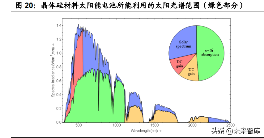 太阳能电池的理论效率首先由半导体材料特性决定。从更深入的层面分析,光伏发电为一种能量的传递过程,半导体中的电子吸收光子能量后,跨过禁带跃迁至导带,留下空穴,当这些获取能量的载流子到达电池表面被电极收集后,就可以通过外接电路将以电能的形式将太阳能传递。由此可知,只有能量大于基材禁带宽度(Eg)的光子才可能激发出光电子,而光子的能量取决于波长,禁带宽度则取决于半导体材料本身,并受温度影响。因此,太阳光谱和半导体材料本身对太阳能电池的理论转换效率有决定性的作用,例如当带隙比较小时,能被激发的电子数量增加,但所携能量减少,反之同理。理论研究表明,常规条件下利用太阳光的最佳材料禁带宽度为1.4-1.5eV,晶体硅则为1.12eV,仅有大概30%多的太阳光能量可以被利用,再综合其他因素,晶硅电池的理论转换效率约29.4%。