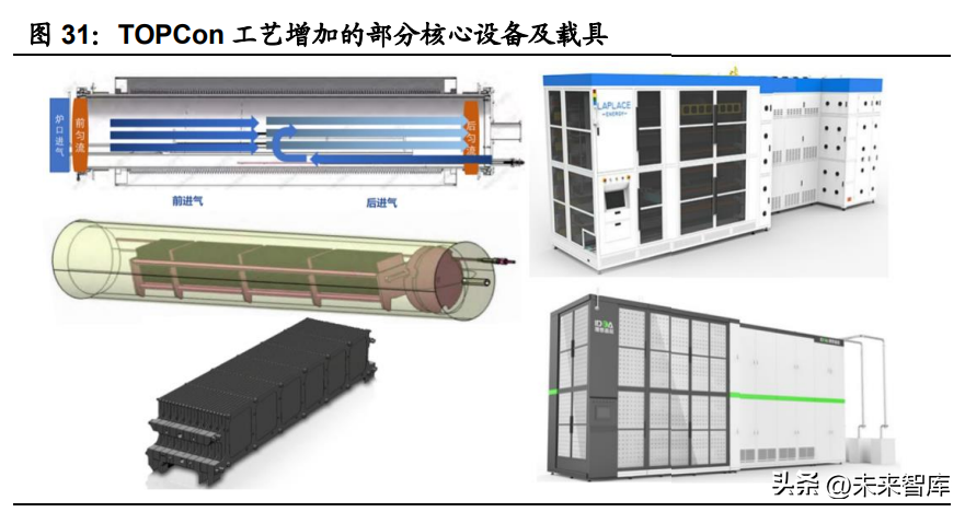 在核心工艺之外,目前业内也还增加了一些额外的工序,有利于提高电池效率,例如:1)硅片吸杂,即通过适当处理,利用硅片内部的氧沉底降低表面金属杂质影响,2)光注入退火,即通升温激活电池中的氢原子,再通过光照改变其价态来提高钝化性能,最终达到提升开路电压和填充因子,提高转化效率的目的。