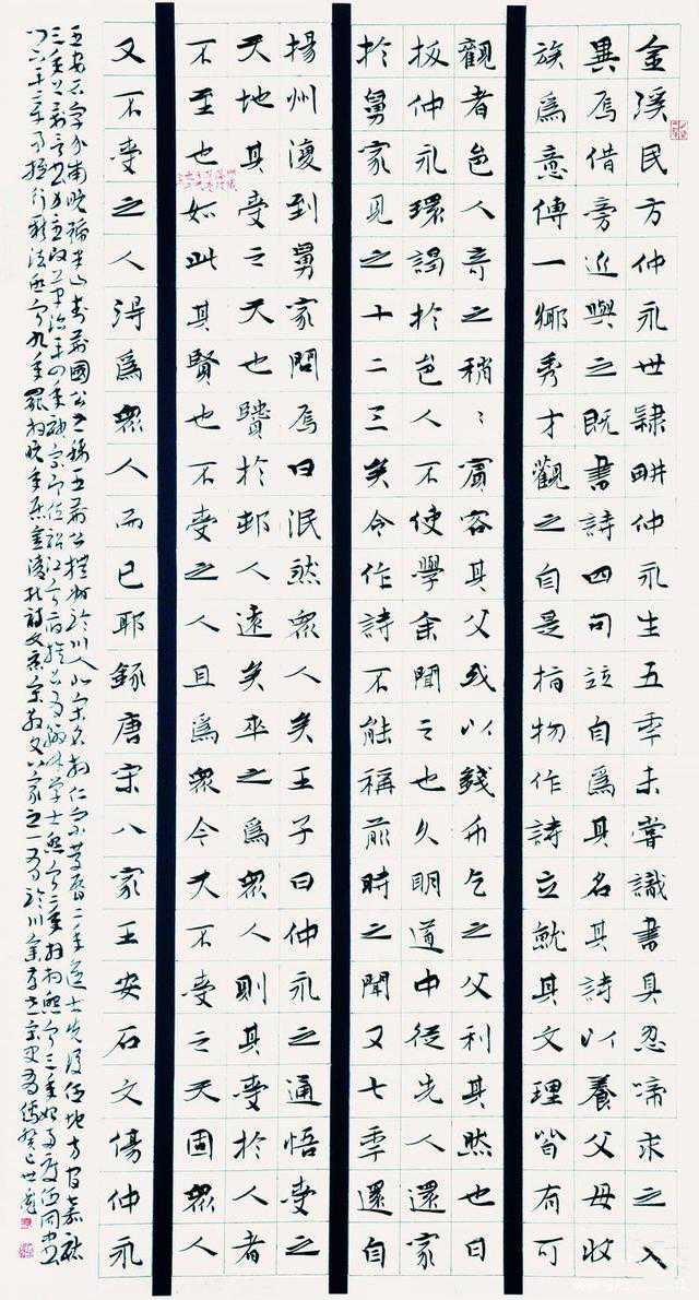 但是,由于事务繁忙,拖来拖去就到了截稿日期。不过脑海中时常在打腹稿,慢慢地就有了一种自己认为比较新颖的格式,即两张界格竖条书写《墨池记》主文,中间用一张稍窄点的竖条以朱砂书写文章与作者简介及落款,并连接主文竖条,素面稍带红色,犹如素衣美人唇涂红珠,此正所谓点缀娴雅。