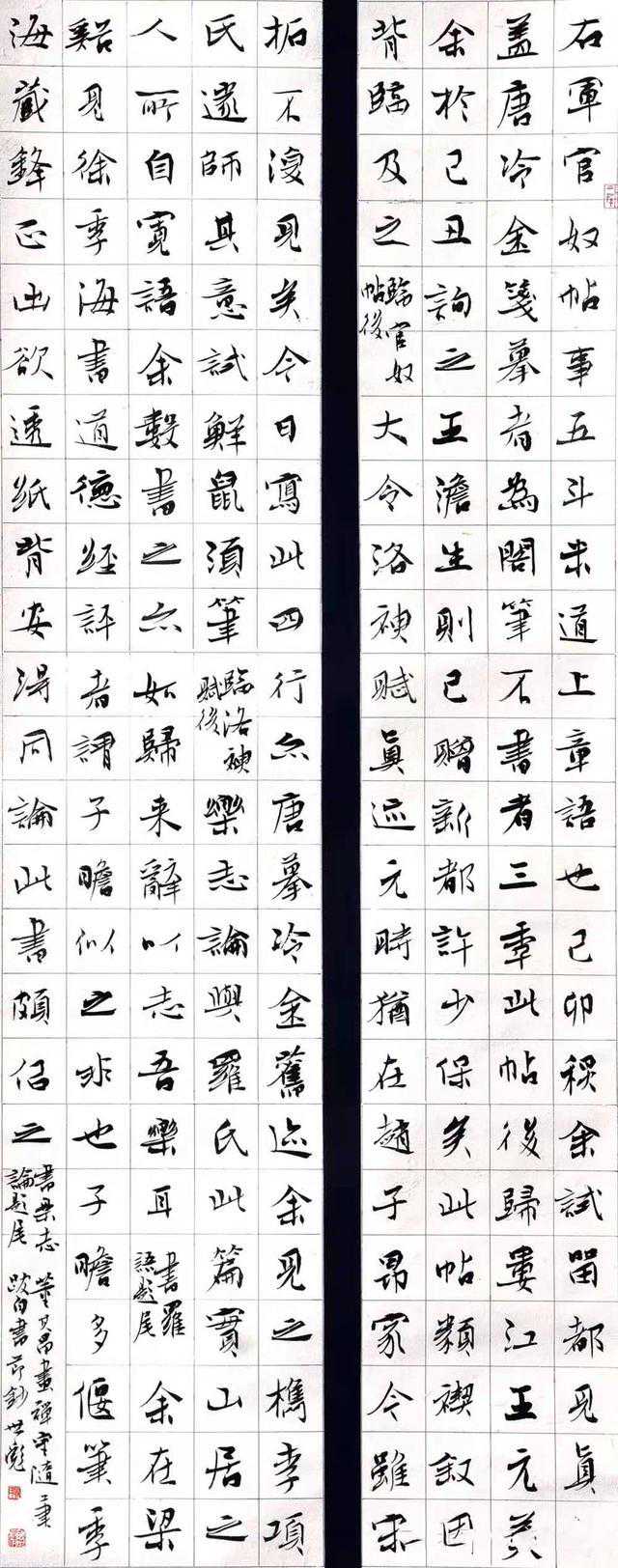 动静相宜,轻重结合,欹正错落,富于趣味的书写境界,使楷书活泼而不呆板,充分体现行草技法糅入楷书的灵动效果,方能达到“违而不犯,和而不同;留不常迟,遣不恒疾;带燥方润,将浓遂枯”之效;书写出“变穷态于毫端,合情调于纸上”,通篇一致,首尾呼应的作品。