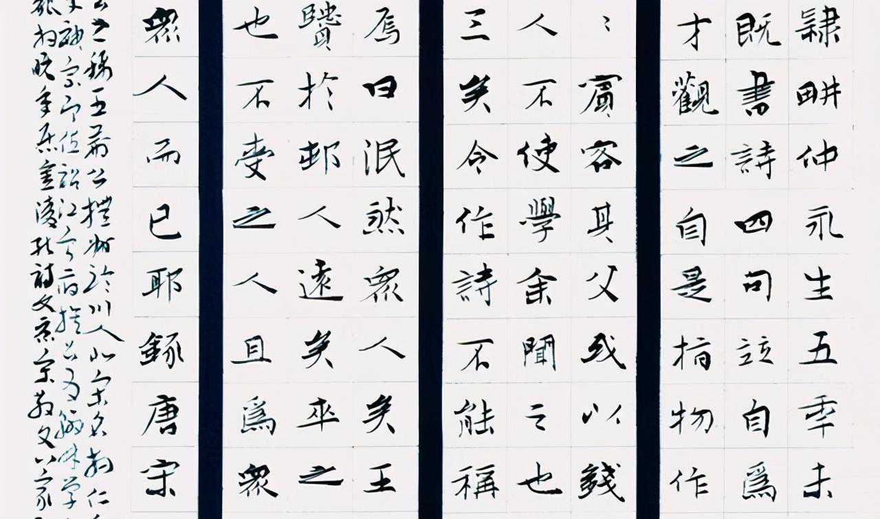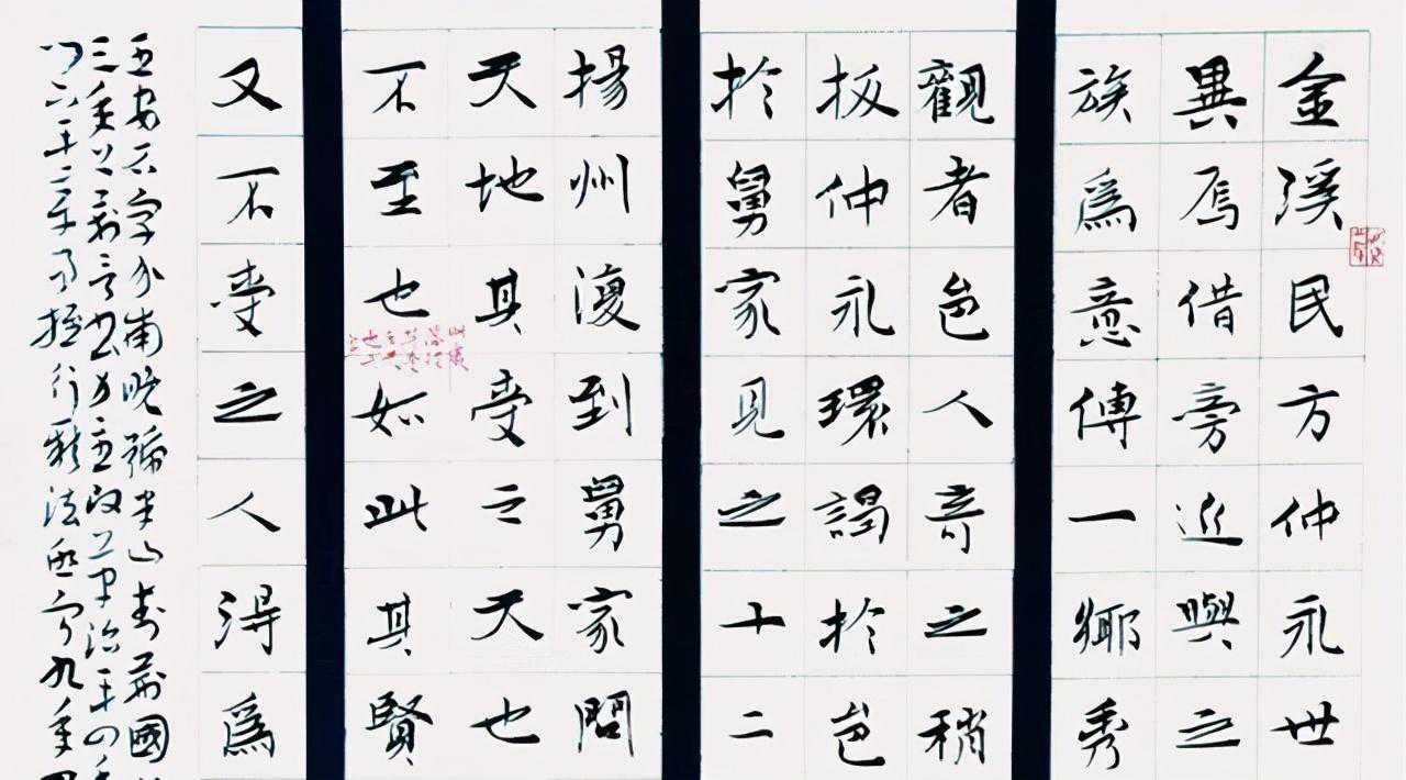 第三是作品的基本要求和书写效果。《八诀》云:“东映西带,气宇融和,精神洒落。”用晋人楷书之萧散,横向取势做基调,掺以魏碑之方笔,以行草映带技法糅入书写之中,尽可能达到刚柔相济。