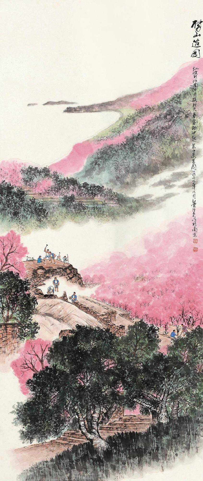 2、1952年由画家黄纯尧创作的《劈山造园》设色纸本画,作者在画中自题为:红旗到江南,日月换新天。春雷动地起,荒山变果园。