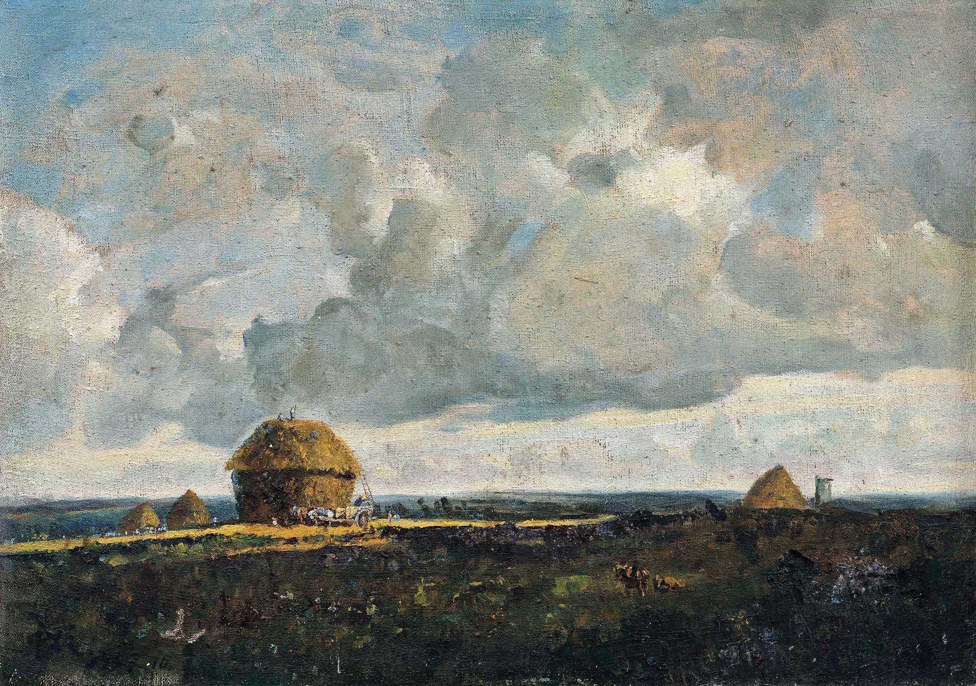 5、1957年由画家艾中信创作的《秋收》油画,秋天的时节,蓝天上白云涌起,大地田野堆起了一座座麦垛,社员们登上高处,一起忙碌着,那是辛勤劳作的收获。