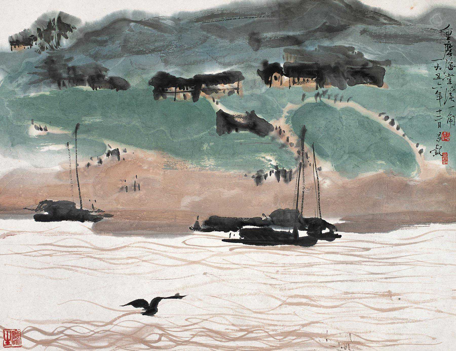 9、1956年由画家周昌谷创作的《重庆海棠溪一角》设色纸本画,水墨的画风,江水波涛连绵,降下风帆的木船停靠在岸边,村落的民居掩映在山林和坡地之间,当地的百姓三三两两走在路上。