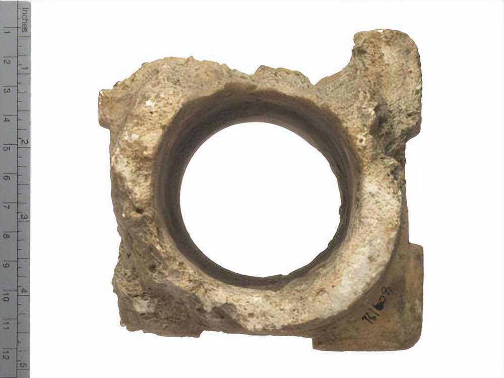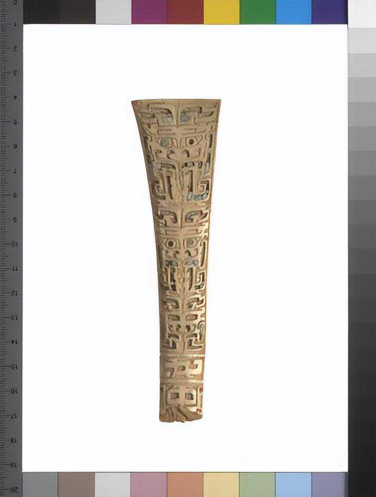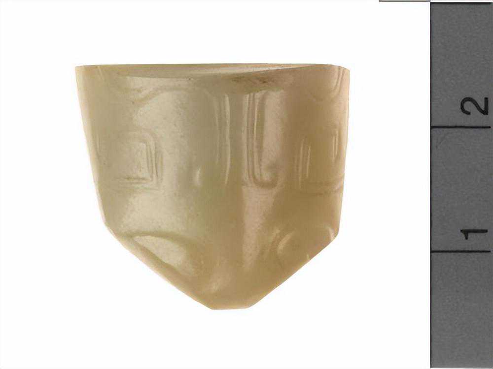 器为弧状,两端有孔,外面刻有带目文之纹饰两组,色白,微有斑。