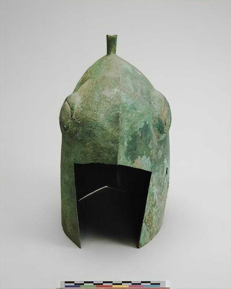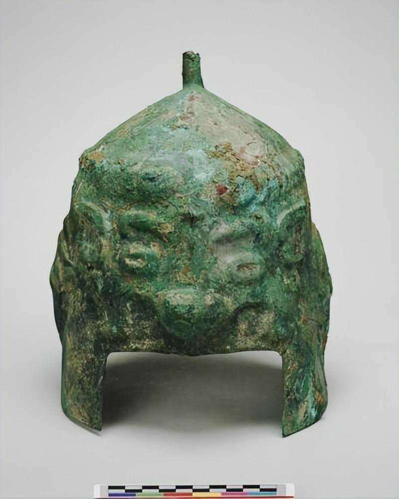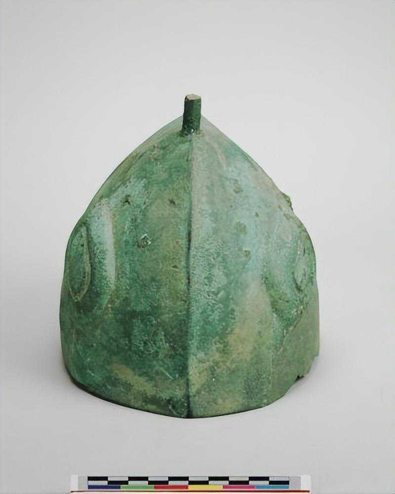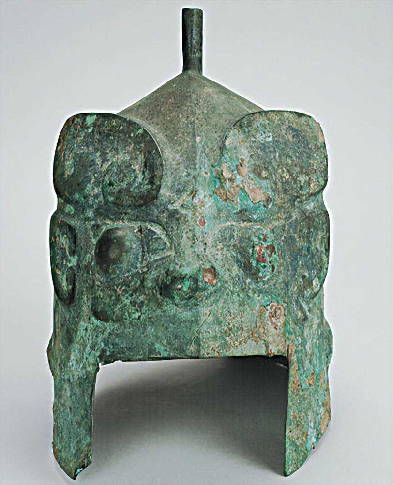 顶端略尖,盔身成圆筒状,顶中有一圆管是插羽毛用。。。前有长方形缺口,正面饰双捲角兽面纹,无眉,双眼和鼻端圆突,两侧有圆涡纹,纹饰中有一孔,遍体绿锈,底部残破.