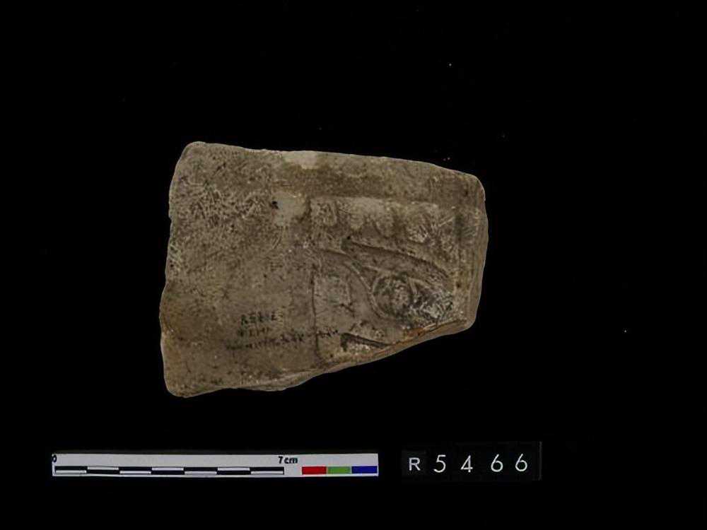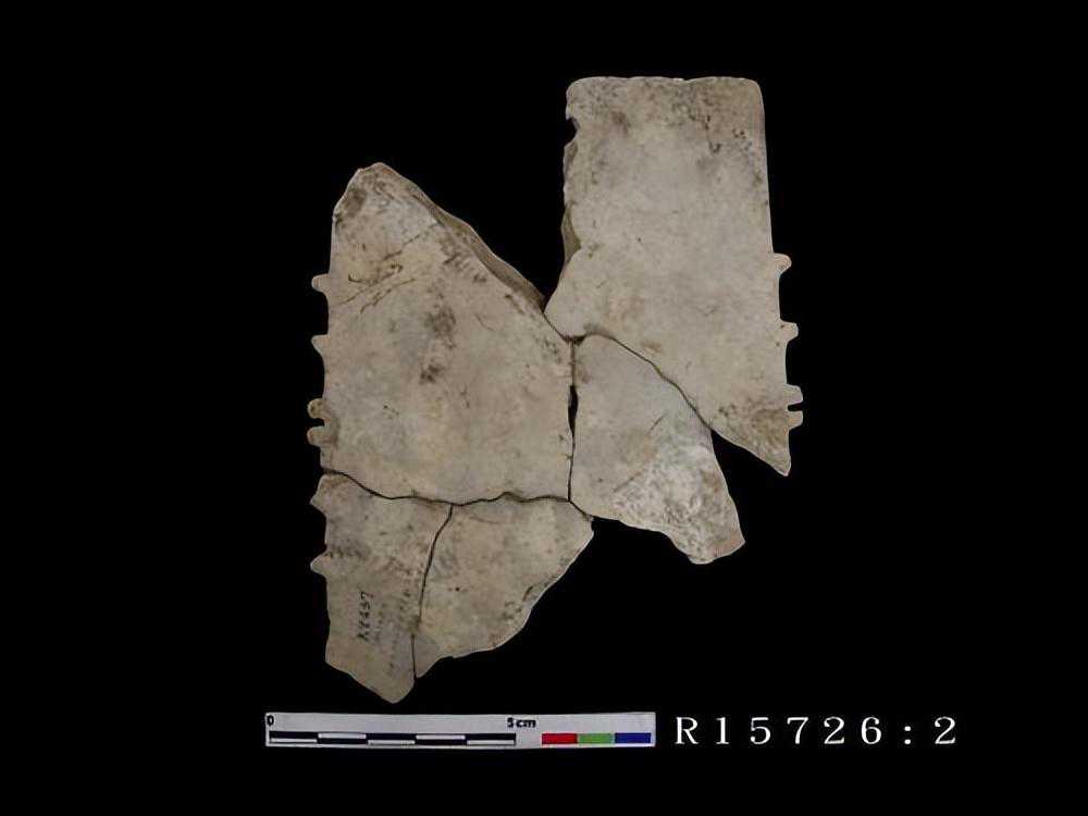 为一面平面,石片上浮出一兽头,兽之两角高耸,下为两眼,石片上下有穿孔,并有涂珠之刻文,惜残缺,不知其全形,色黄。