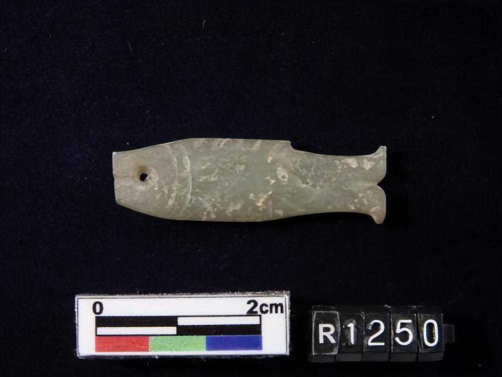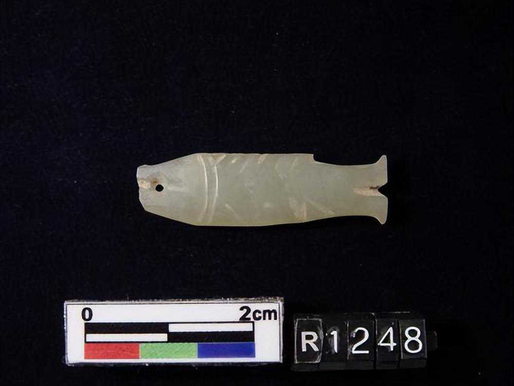 1443墓。。。玉鱼璜,目為一小孔,背腹鰭均為細小之刻文,尾薄如刀刃。。。