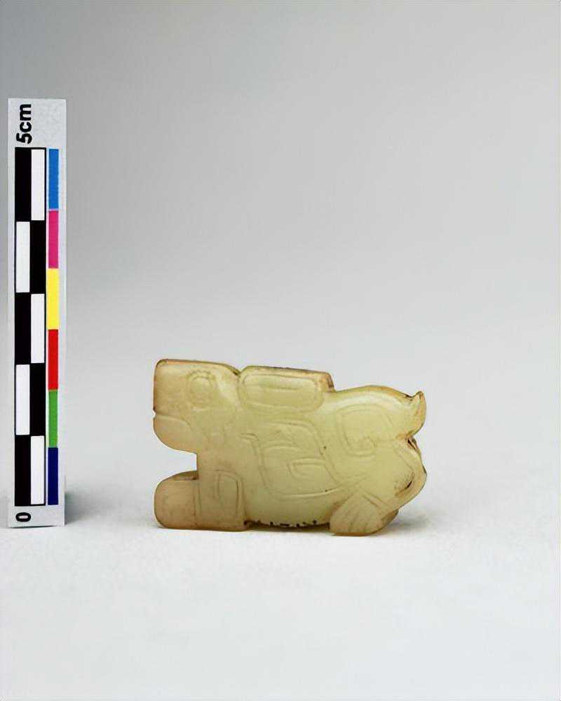牛形立雕,口微张如一长条,头上两"臣"形眼,鼻刻为"()"形,眼后为一对弯角,曲伏于背上,表面上刻有简单文饰,下为两小耳,仅有阴纹表现,背部近平,四足略具形式,有短尾,色灰白。