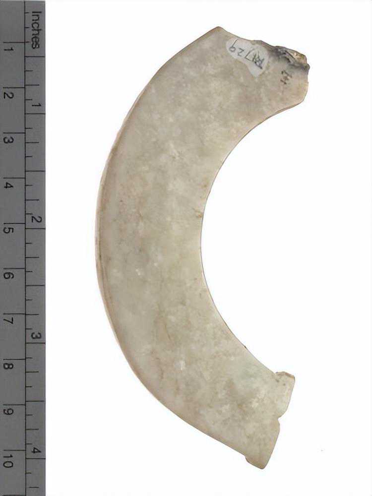 半圆形,一端残缺,一端有一小缺口,质极硬,色青绿