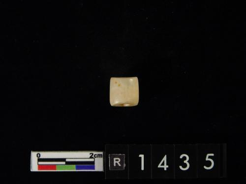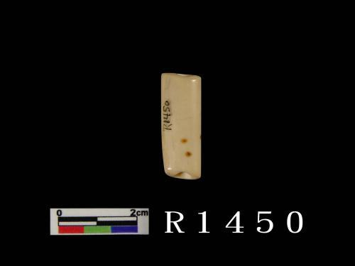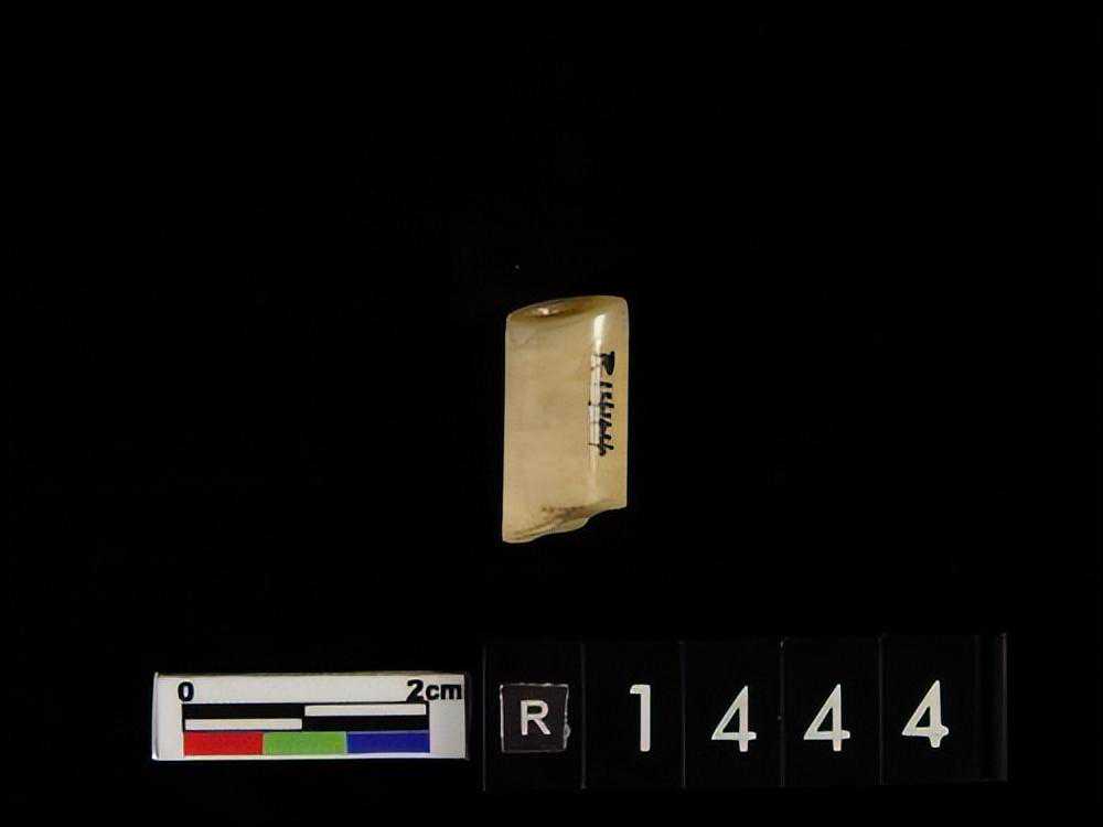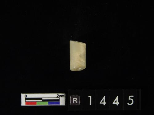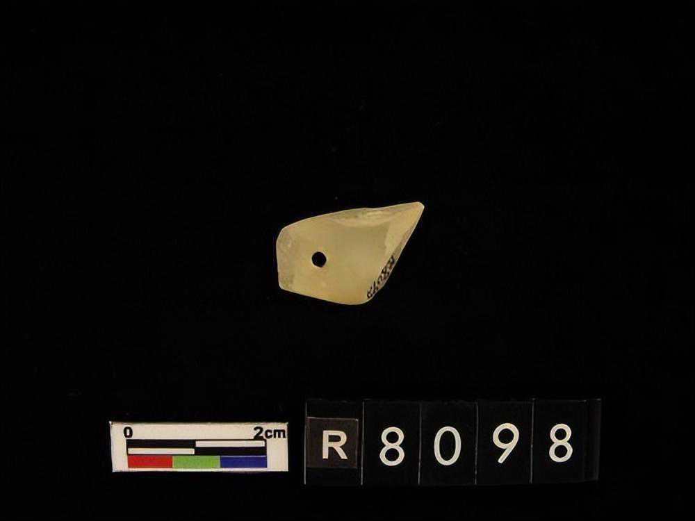 白色残片,表面平齐且光滑,一长边有四齿残存。另一端呈断裂面,残存有一圆形穿孔痕,表面部份呈剥蚀粗糙面。