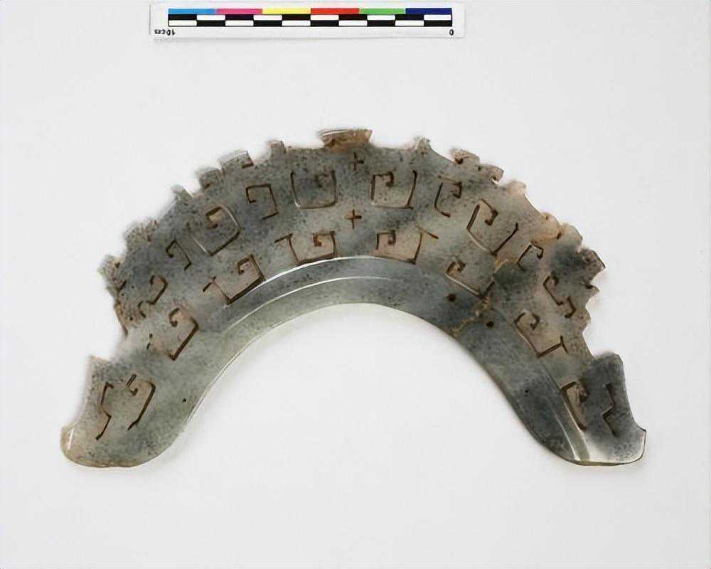 半圆形,上段内圆处有一窄条,但有四小孔,其他全为镂空之云雷纹,质甚硬,色淡青。