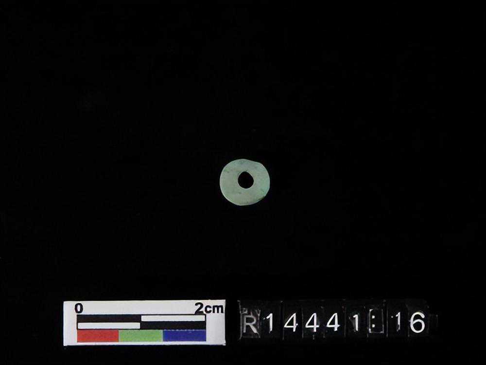 中有孔,连一缺口,似玦而椭圆,色淡绿。