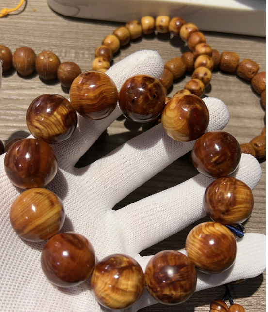 崖柏手串,除了天然纹理,香味也是最大的特色。同一块崖柏料,选择不同部分制作手串,就会导致香味不同。举例而言,根部、干部和中间疙瘩部位的香味就各有差异,一般以疙瘩部位香味最佳。