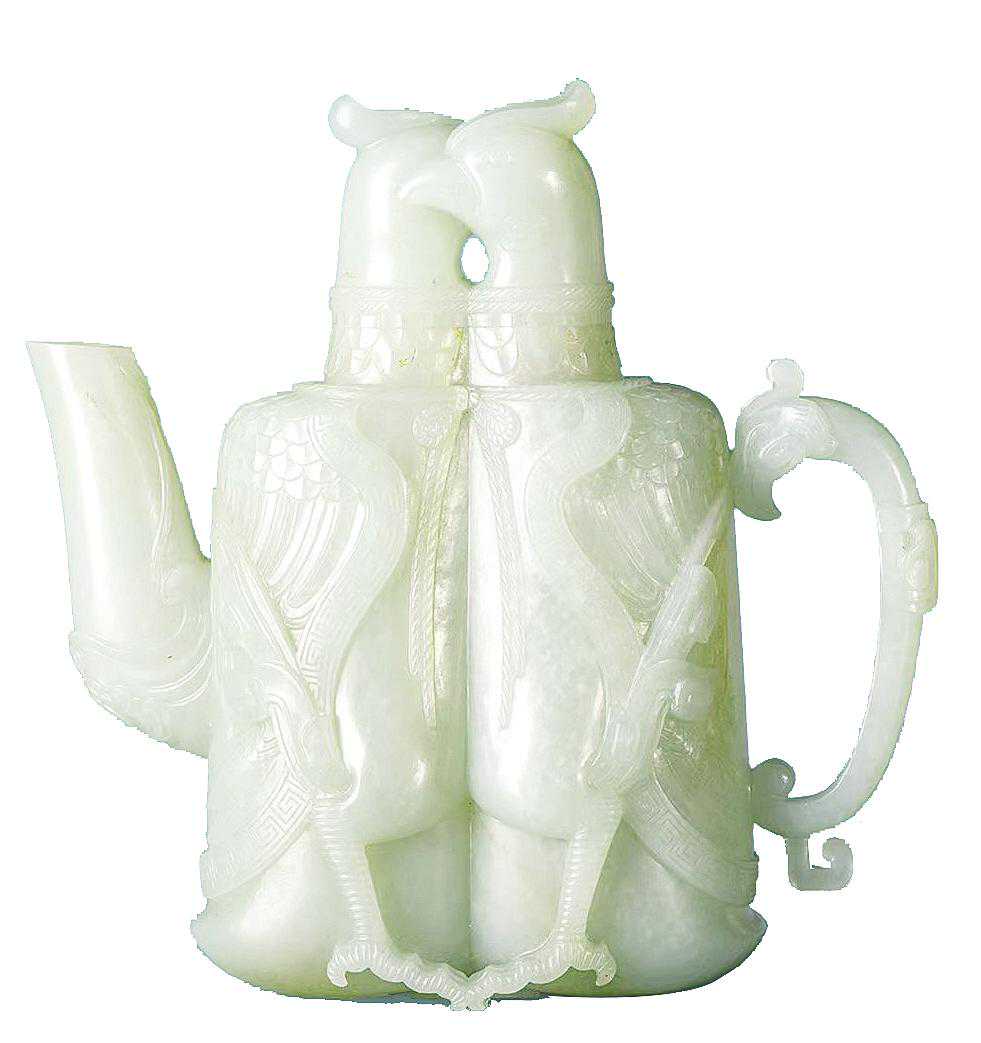 一件清代“乾隆”款双凤交颈玉执壶更厉害了,是宫中举行大婚之礼时所用的合卺之物,壶底有铭文“乾隆御制”。这件玉执壶,玉质洁白无瑕,琢磨精巧雅致,可谓是中国治玉工艺鼎盛时期的杰作。最引人注目的应属玉壶构思奇特的造型:两只亲昵依偎的圆雕连体凤鸟构成壶身;紧贴两颊、交颈私语的凤首雕成壶盖;底部更是两足相抵、亲昵偎依。可谓爱意满满!而这件武汉博物馆藏品,8月4日晚登上央视一套七夕节目《古韵新声》。