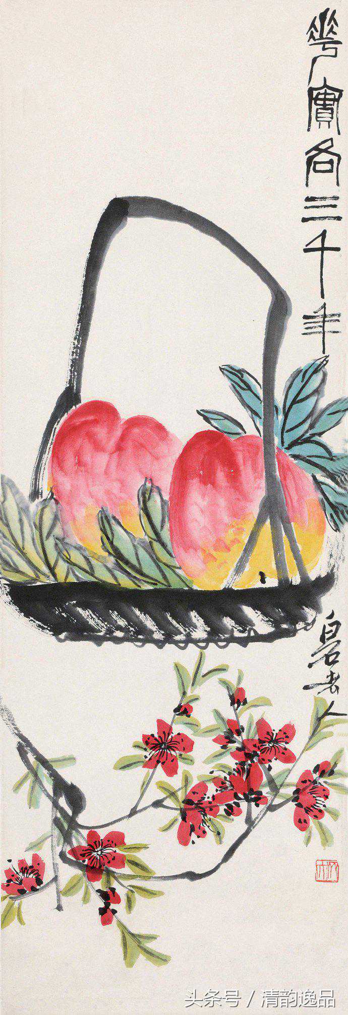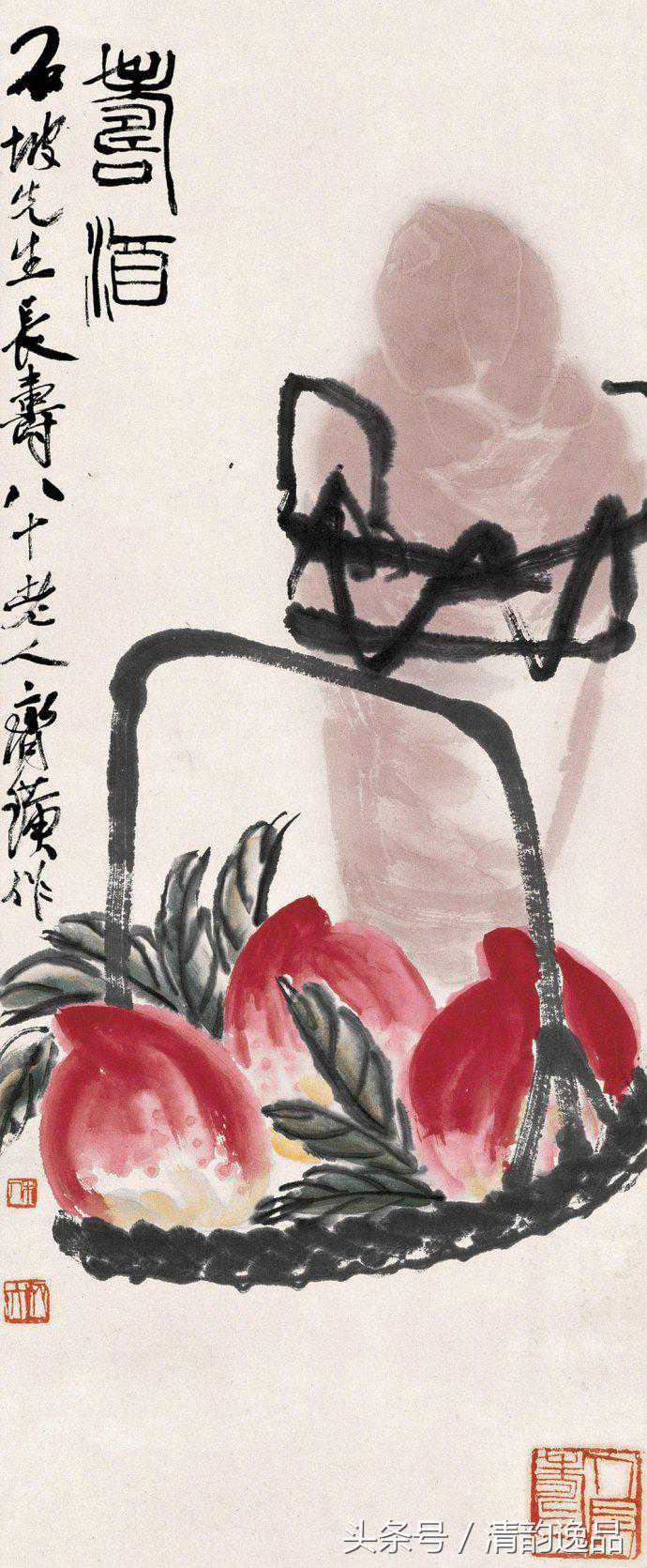 齐白石何时开始画寿桃,尚不清楚。通常所见齐白石画桃,以晚年为多,桃子或画于篮中,或画于树上。白石老人喜欢把桃与桃叶、桃与竹篮的比例加以夸张。如竹篮只能盛下两个桃子,可见仙桃之非同一般!这样的夸张手法,是从民间艺术借鉴来的——雕花艺匠出身的齐白石,对民间艺术的熟悉和大胆借鉴,是成就其艺术的一大根源。文人艺术与民间艺术天衣无缝的融会,在一个桃子形象中也有突出的体现。