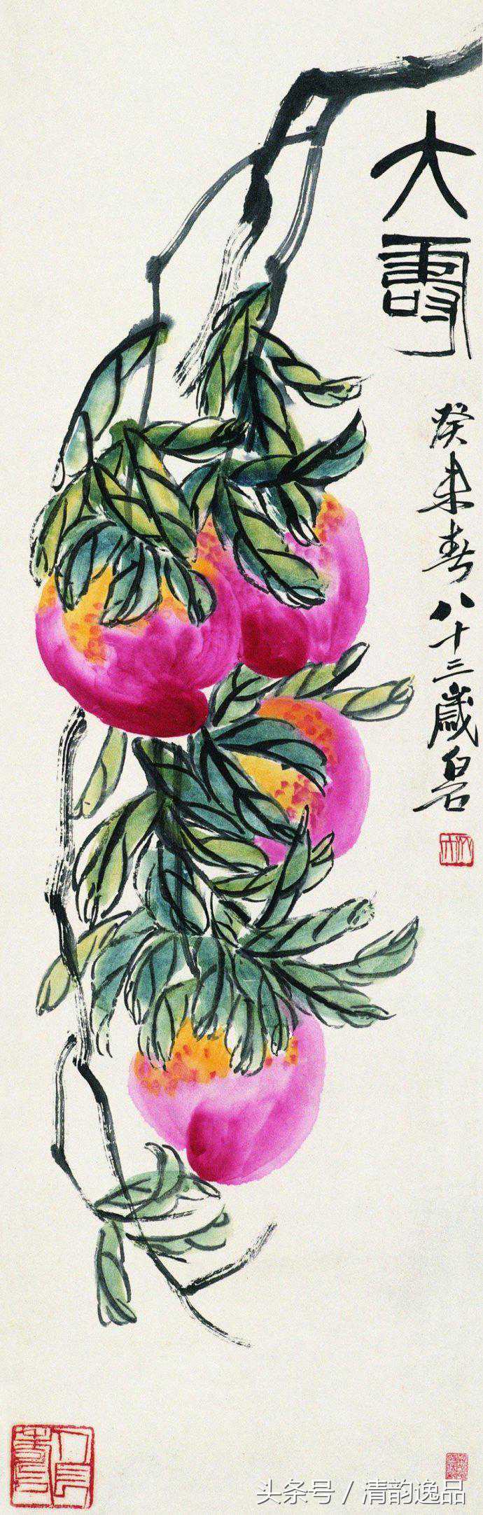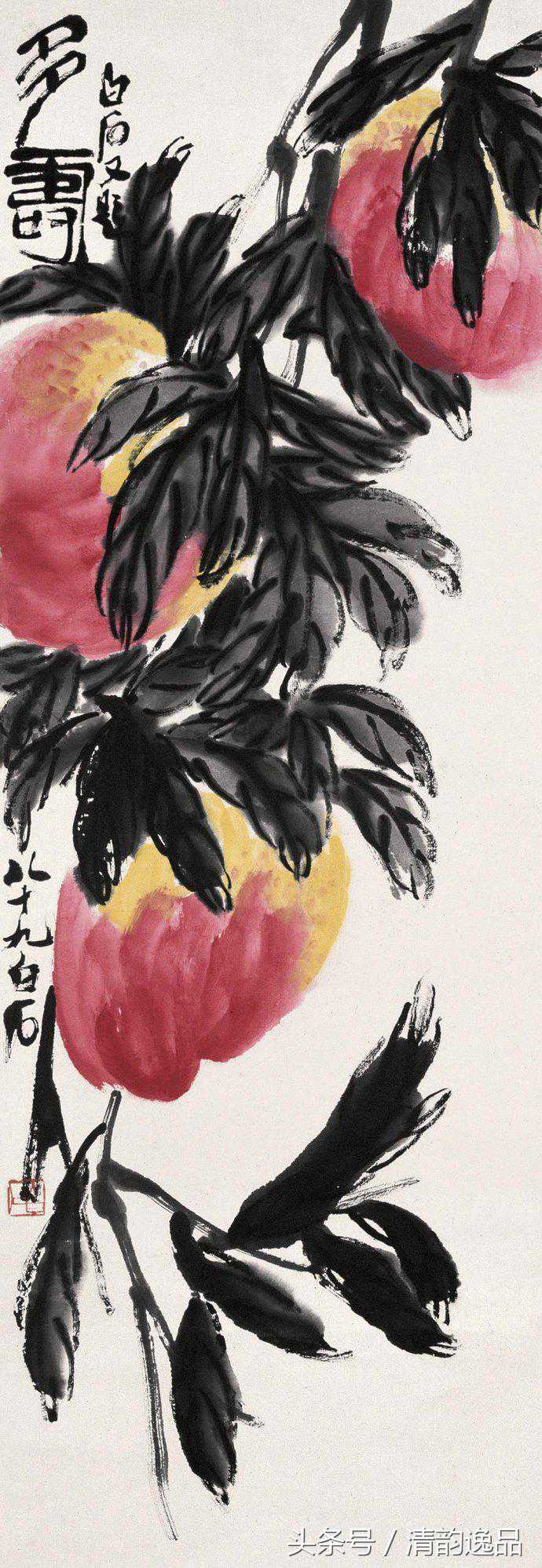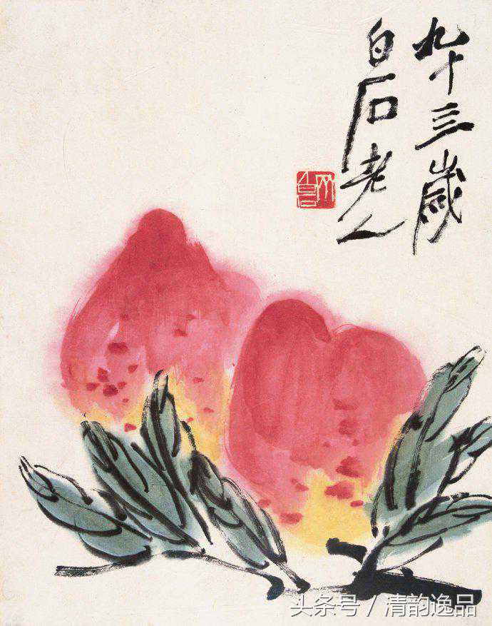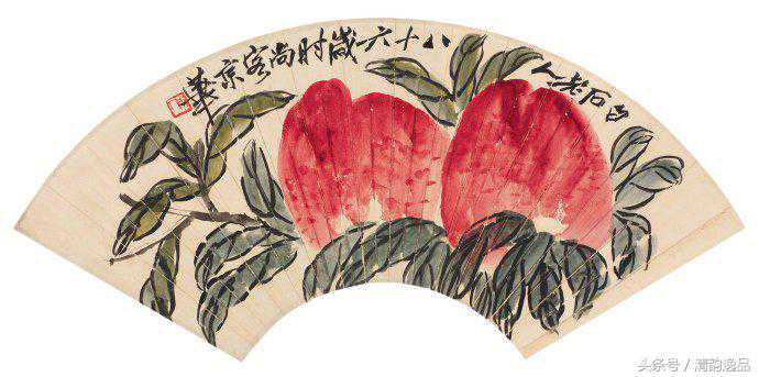 齐白石衰年变法,多取法老缶吴昌硕;但这取法又不是简单的模仿,而是笔墨精神。他自己说:“我是学习人家,不是摹仿人家,学的是笔墨精神,不管外形像不像。”其中尤以画桃极为神似。齐白石画桃,先以没骨大写意法直接用洋红泼写硕大桃实,渗以少许柠檬黄,再以花青、赭墨写出叶子和枝干,后用浓墨勾勒叶筋,设色浓重艳丽。与其画荷花所创的红花墨叶恰成强烈对照。不仅桃实的分布颇具匠心,极臻疏与密、藏与露之妙,即寿桃的向背光都以颜色的变化来确切地表现出来。