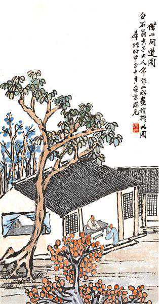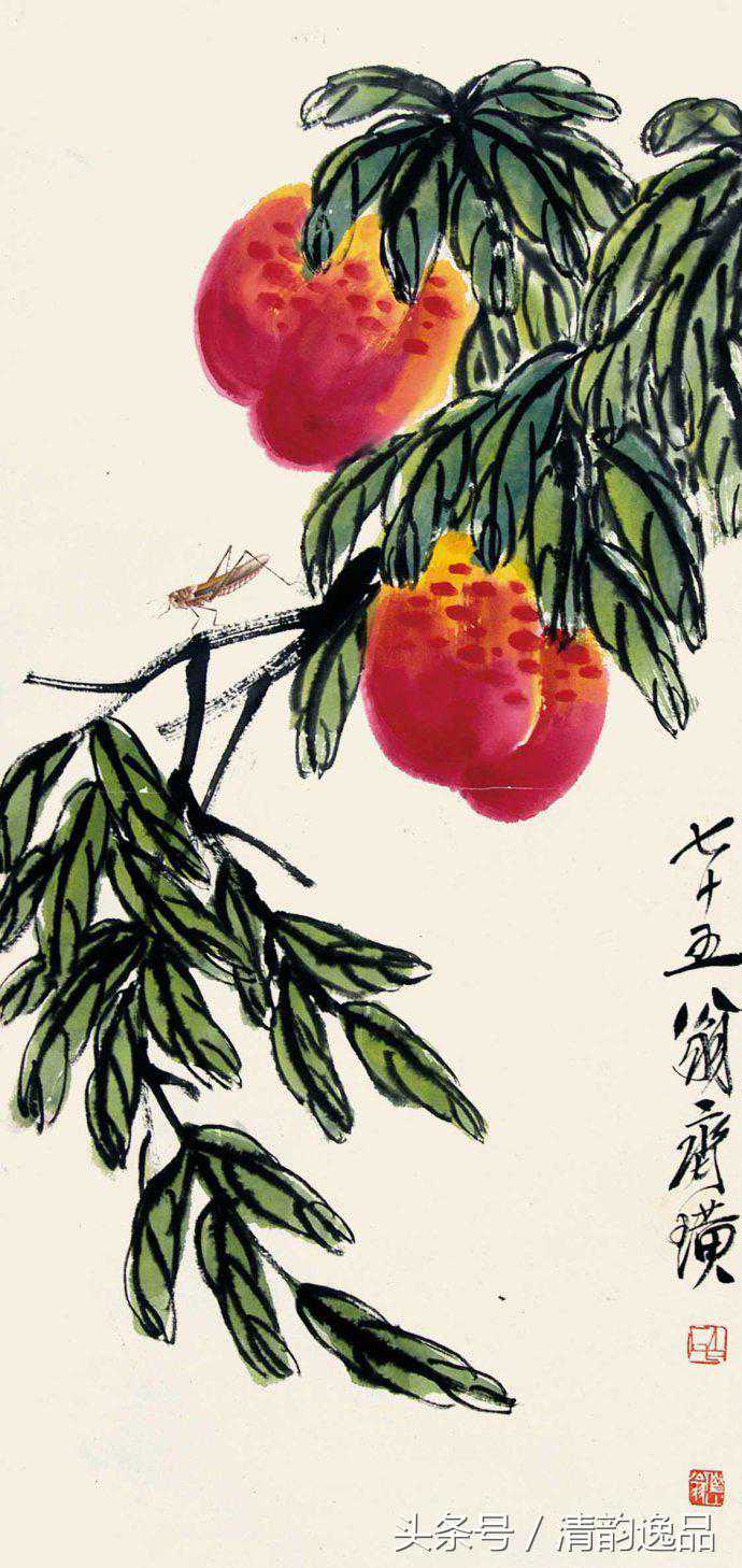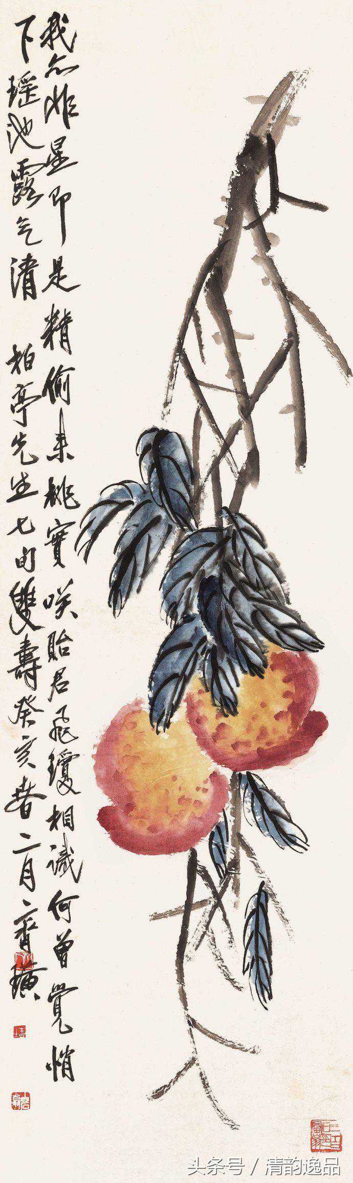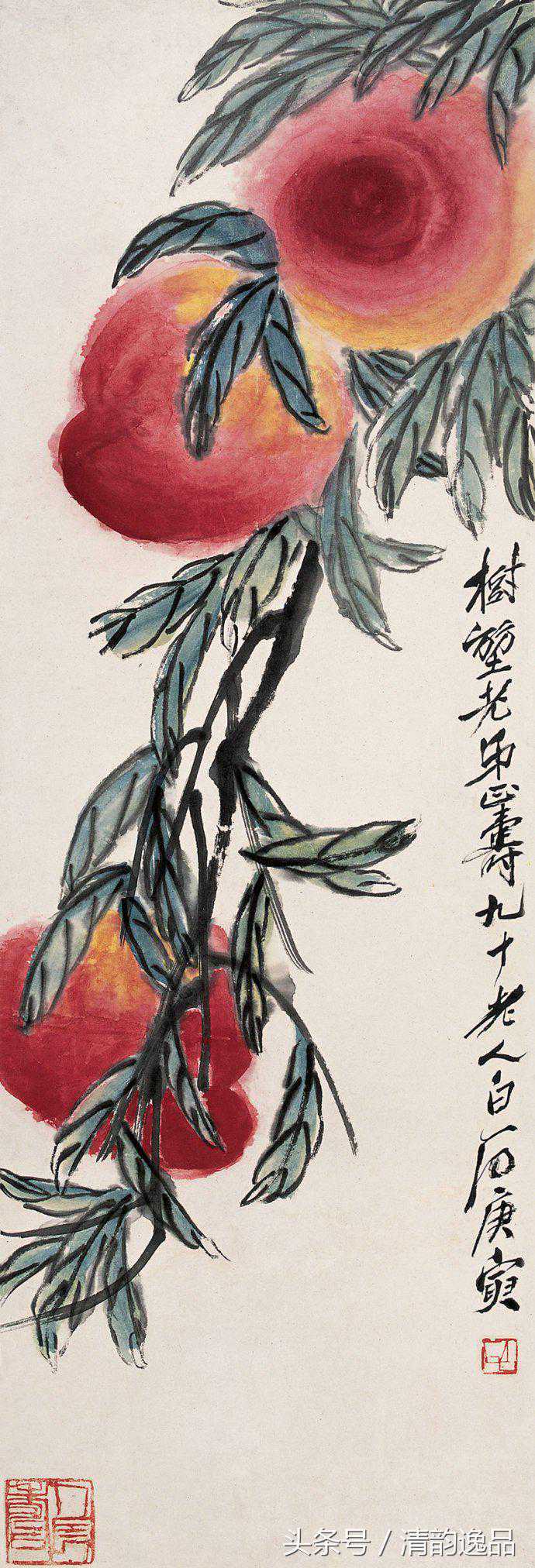 齐白石衰年变法,多取法老缶吴昌硕;但这取法又不是简单的模仿,而是笔墨精神。他自己说:“我是学习人家,不是摹仿人家,学的是笔墨精神,不管外形像不像。”其中尤以画桃极为神似。齐白石画桃,先以没骨大写意法直接用洋红泼写硕大桃实,渗以少许柠檬黄,再以花青、赭墨写出叶子和枝干,后用浓墨勾勒叶筋,设色浓重艳丽。与其画荷花所创的红花墨叶恰成强烈对照。不仅桃实的分布颇具匠心,极臻疏与密、藏与露之妙,即寿桃的向背光都以颜色的变化来确切地表现出来。