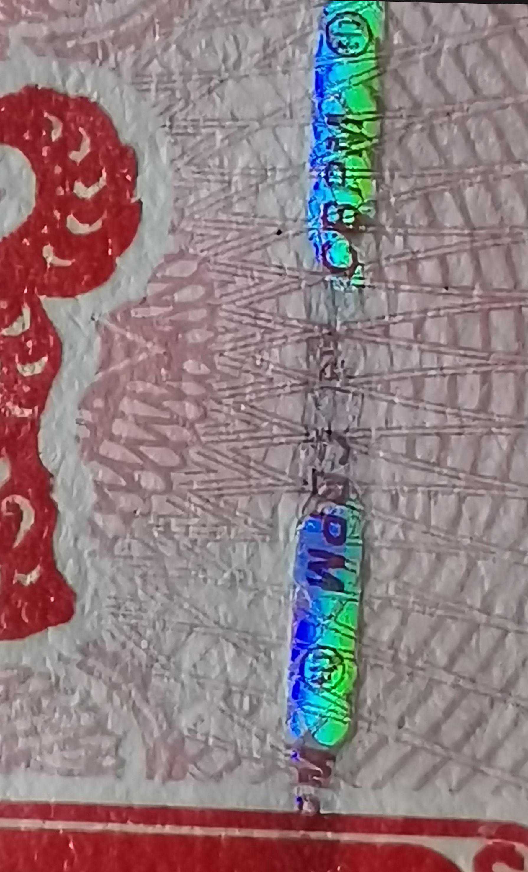 迎光透视观察,安全线部位可见有序排列的长方形图案,形状酷似条形码,因此称其为“条形码水印”