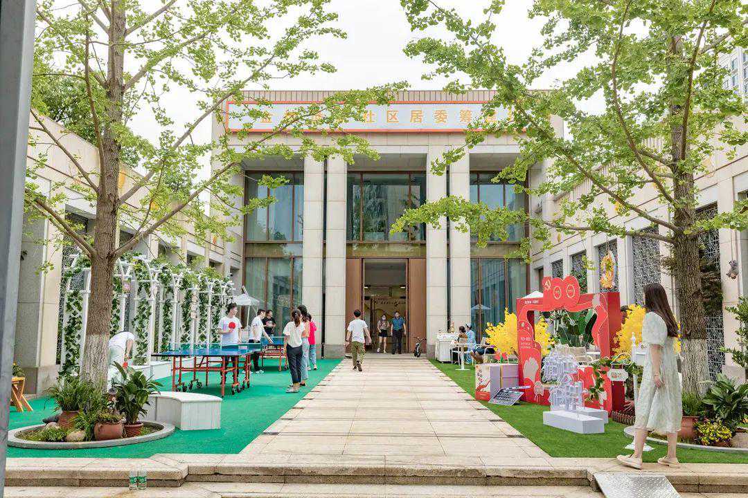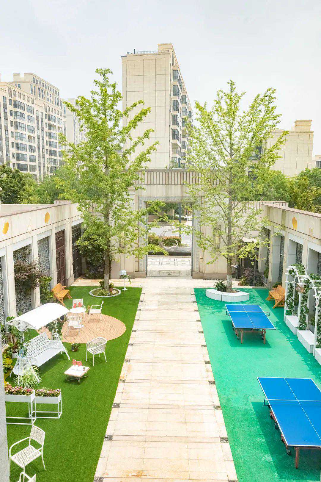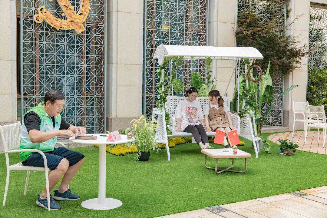 为此,在这片20余平方米的“初心花园”里,一侧摆上了两张乒乓球桌,一侧则铺设了草坪,设置了田园风情的秋千桌椅,动静两相宜。每逢节假日开设“阳光市集”时,这些桌椅球台又可以折叠后腾出更多空间,实现复合高效利用。