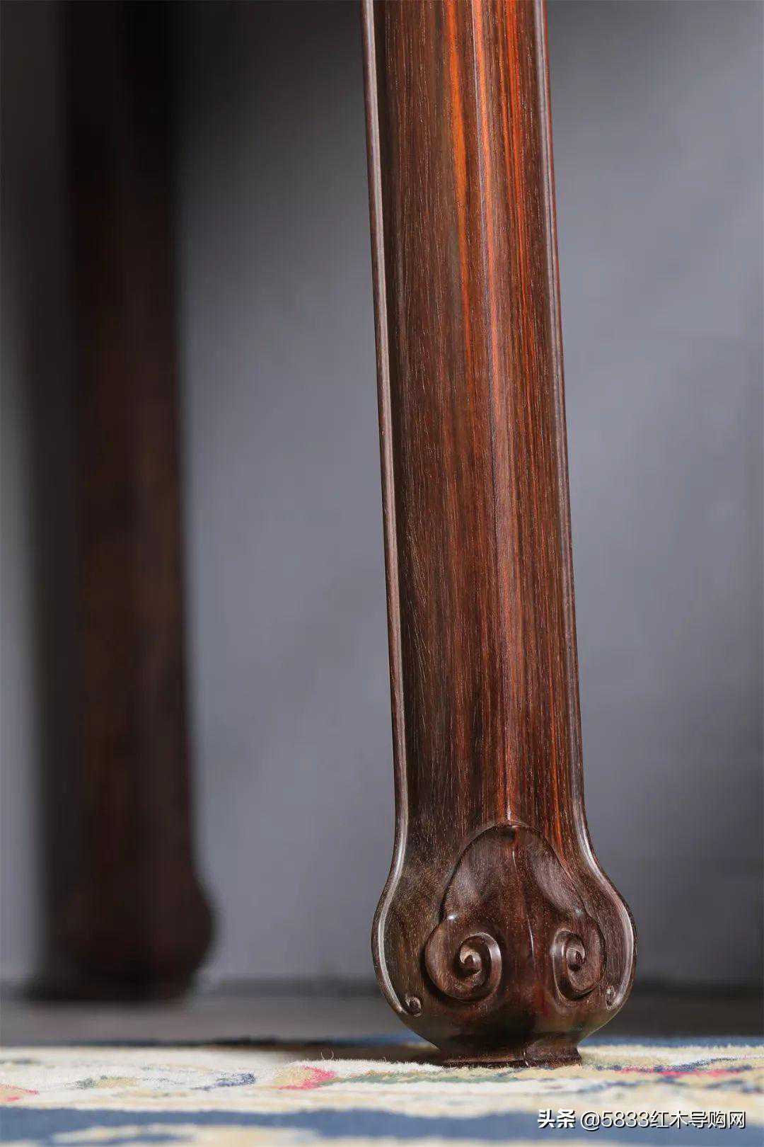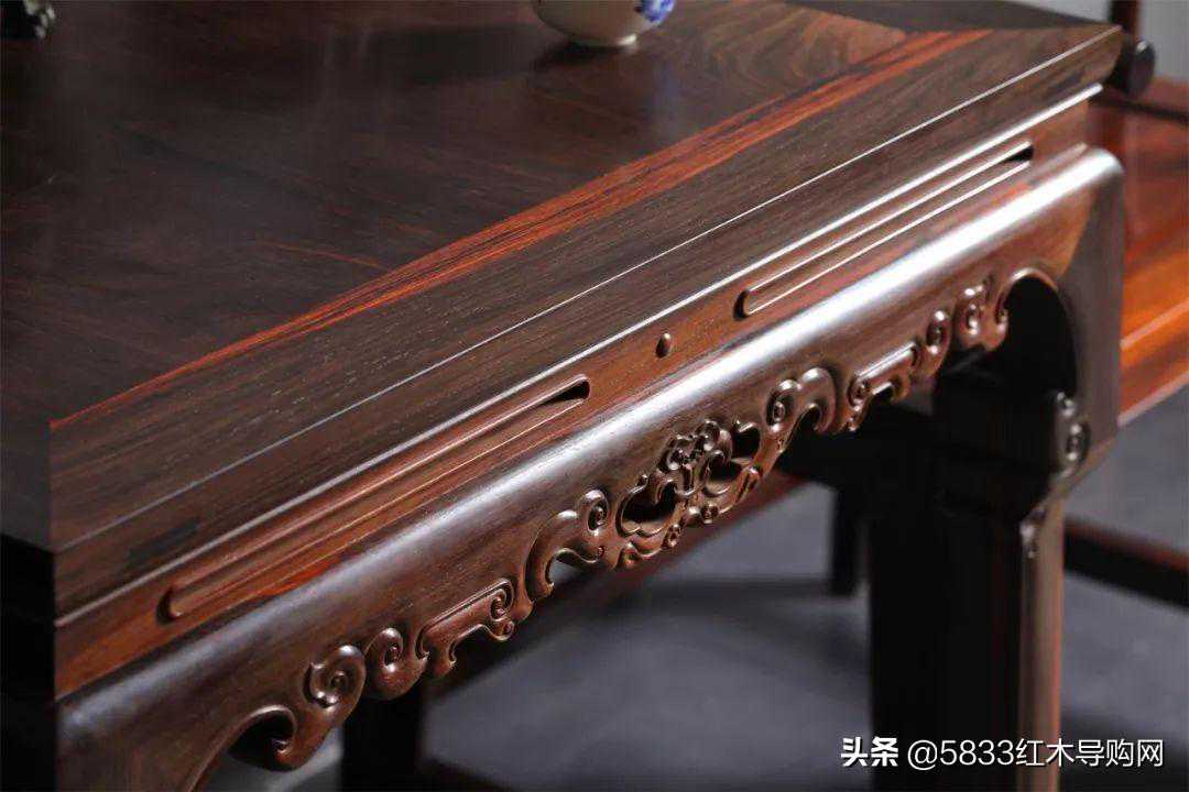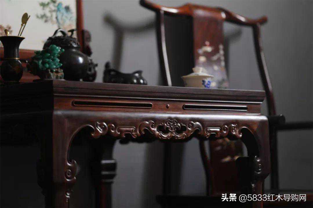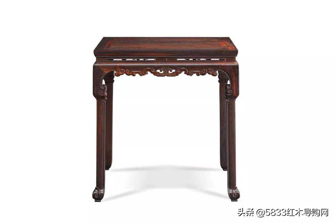 此桌精选大红酸枝料,材质上等,束腰开光。攒框镶独板面心,牙板雕如意云纹,寓意吉祥如意,折腿,足底回折翻卷云纹。品相精美,端庄秀丽,形制娇俏,做工精湛,沉厚古雅。
