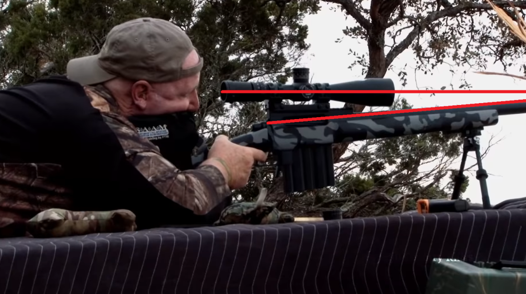 国外在进行4549码距离射击挑战时展示使用的射击情景,可以看出枪管和瞄准镜之间存在明显的夹角