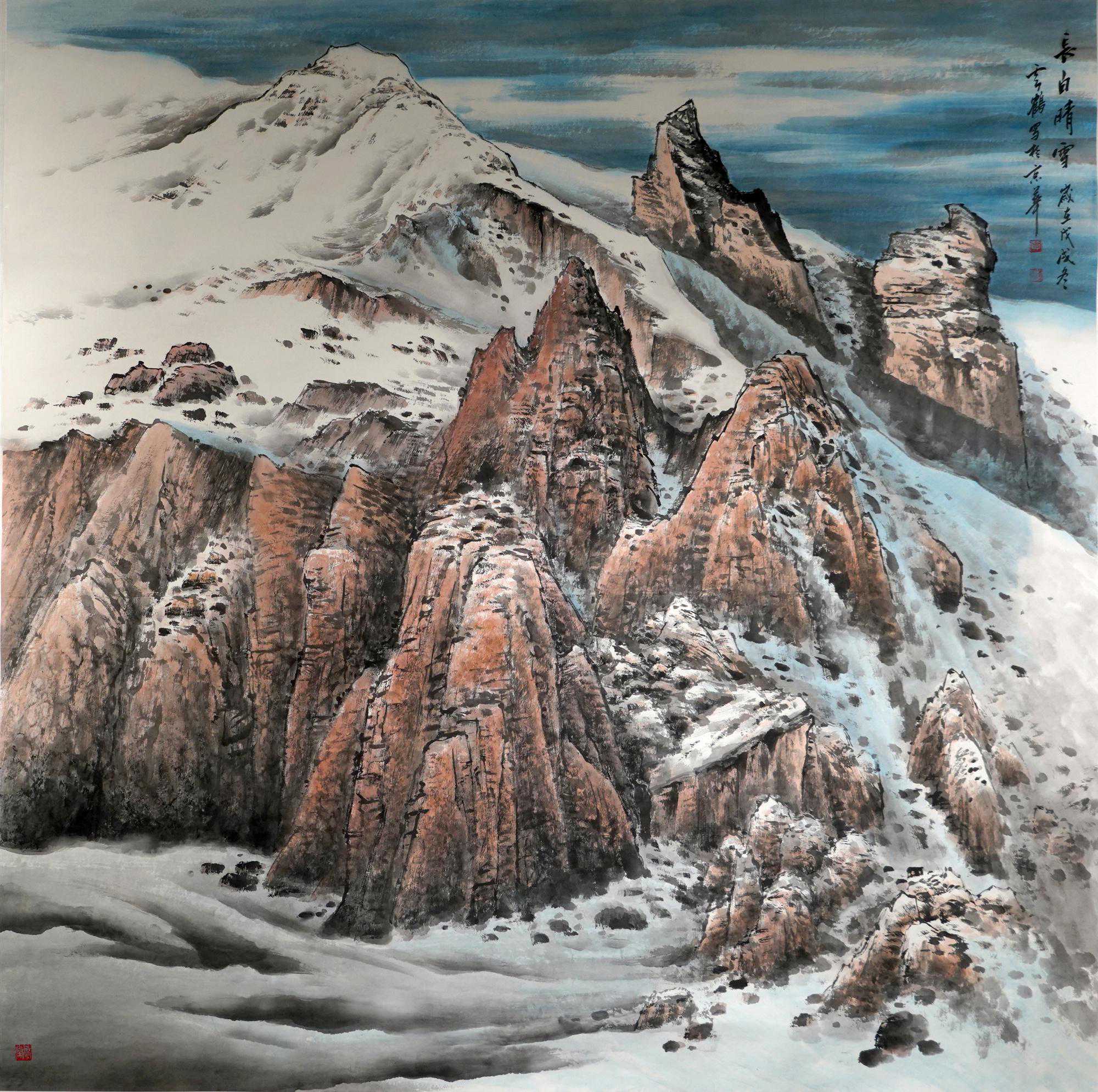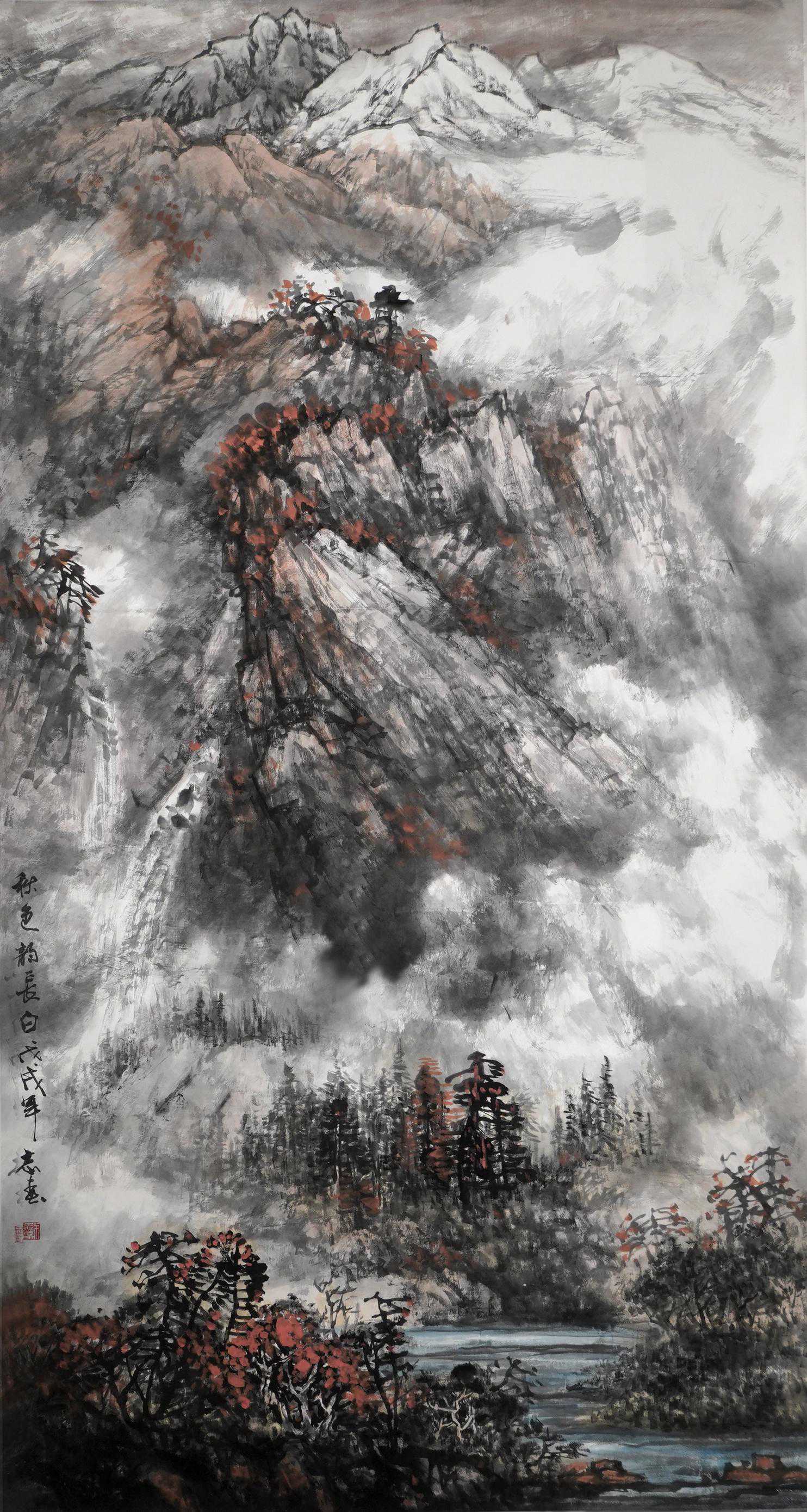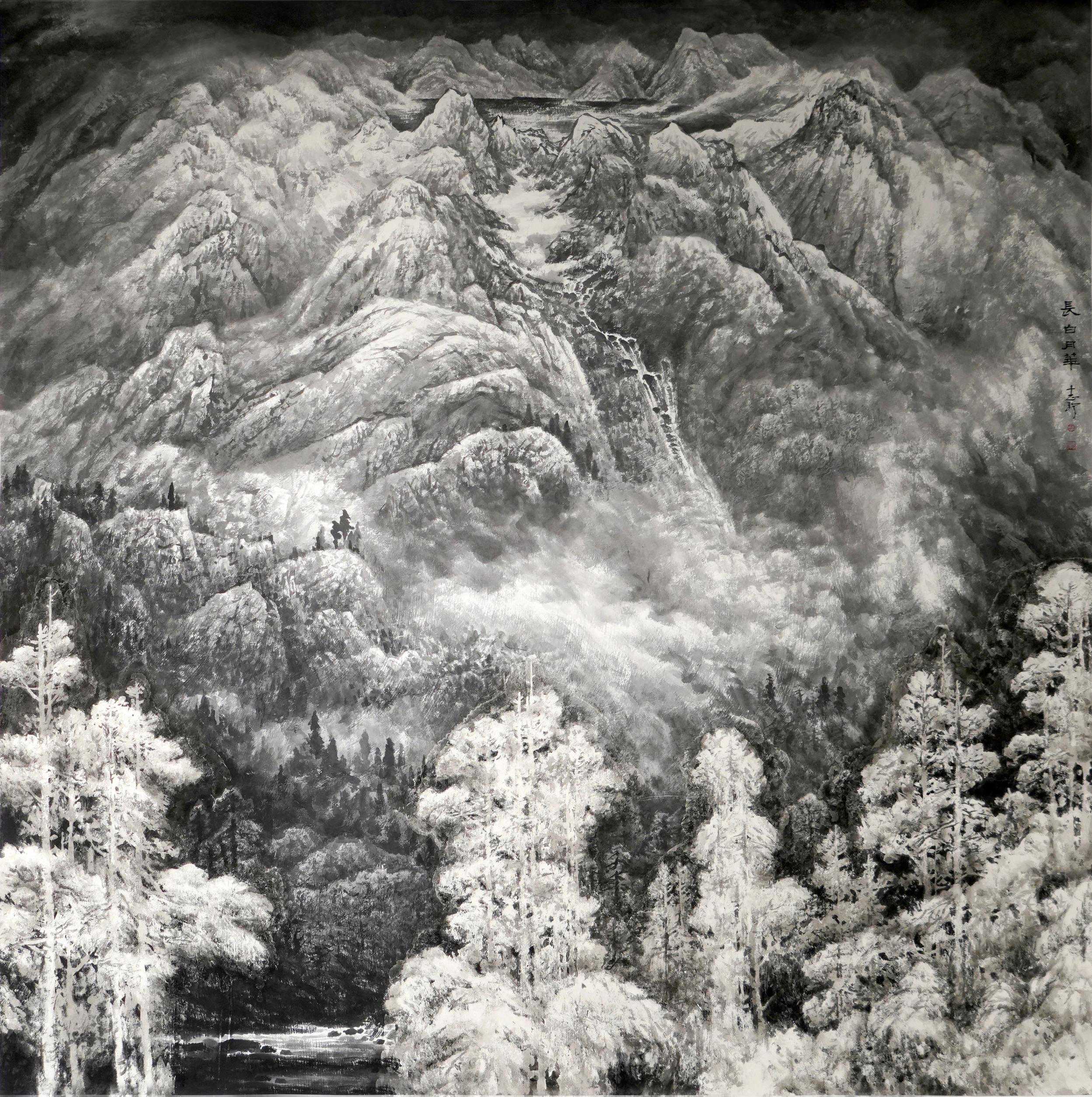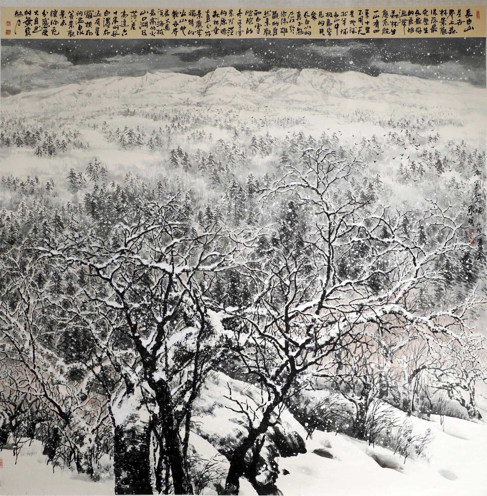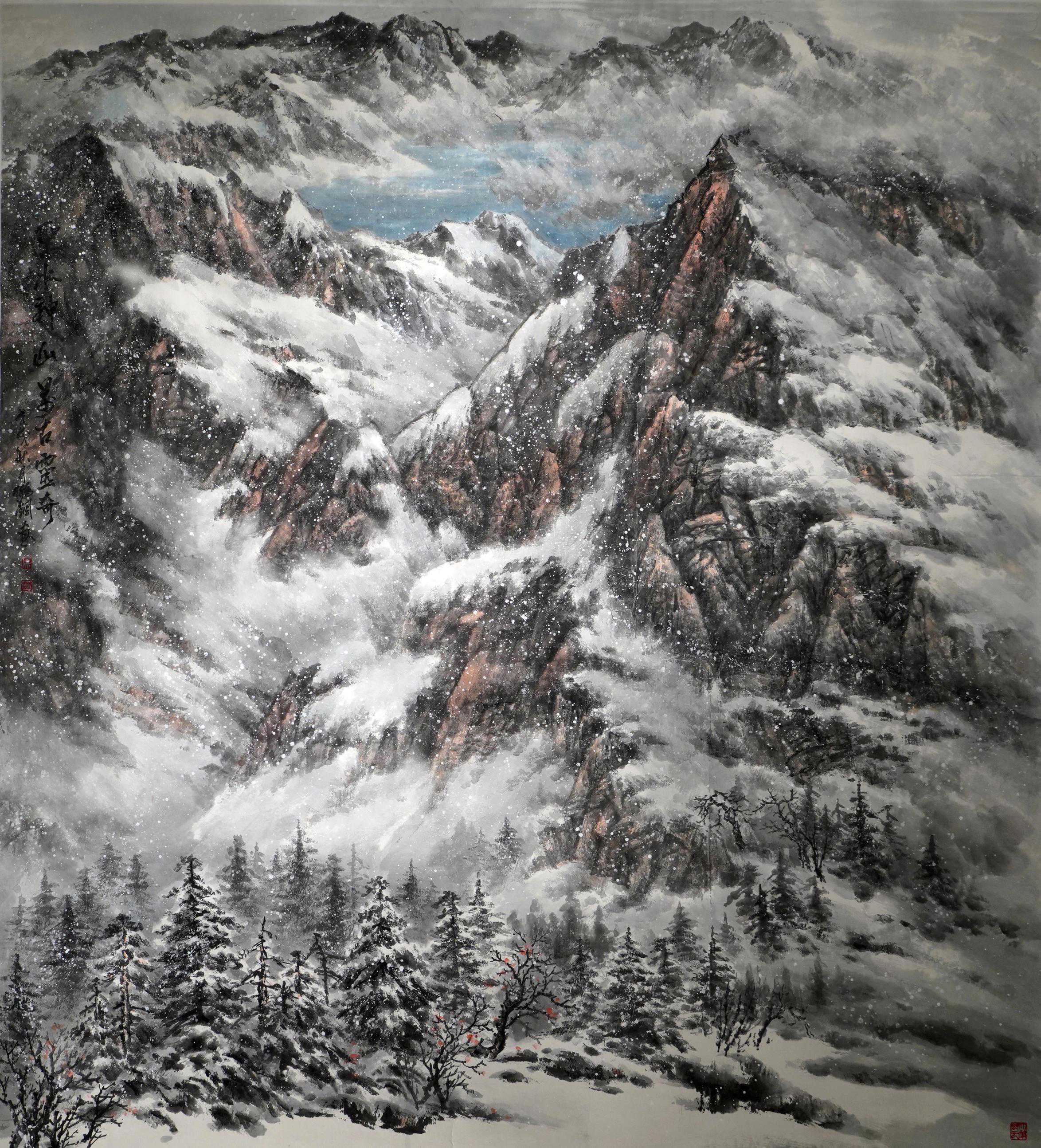 以“笔墨回归丘壑,为祖国河山立传”为宗旨的当代北派山水画家队伍,是由一批有识的画家自发组织起来的美术创作队伍,没有任何官方背景,也没有可以依靠的平台,但正如古人云:“位卑不敢忘忧国”,画家们自觉地紧随时代以大山水画风描绘祖国的大美河山,立足传统笔墨,勇于开拓创新,塑造当代北派山水新格局,我们祖国东北的长白山,在许多人心目中是谜一般的神山圣水,也是北派山水画家们心驰神往的艺术创作圣地。