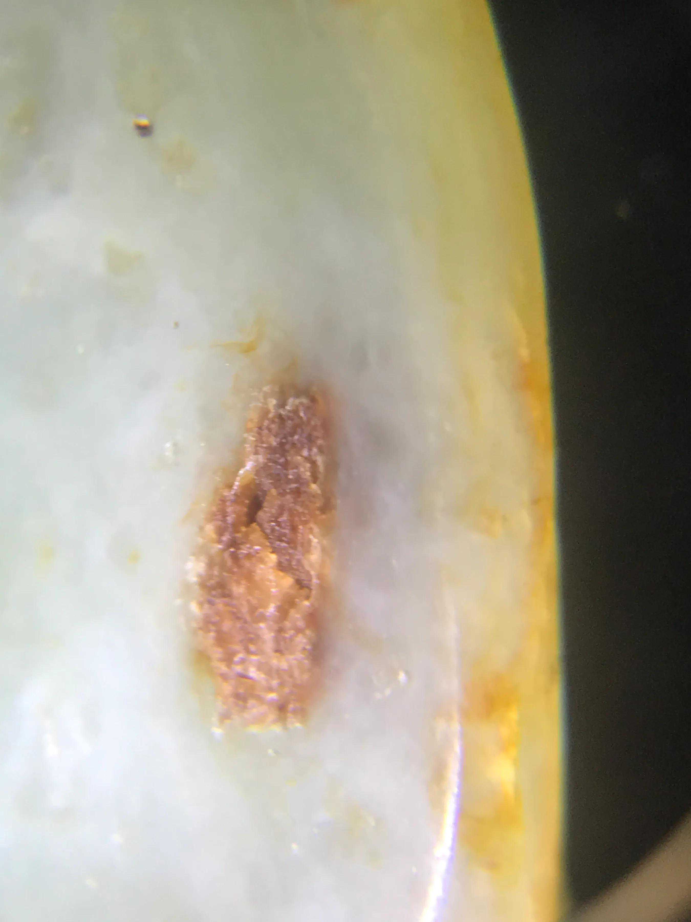 战国玉勒子,有红沁,饭糁,微钙化的同时,在放大镜下,有土咬土蚀,肉眼难分辨。