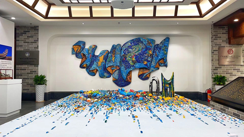 步入展厅,由汕头文化创意产业协会美术专委会主任陈旭南创作的嵌瓷作品《海·魂》分外引人注目。深浅各异的蓝色瓷片层层重叠,仿佛浪潮奔涌而来。