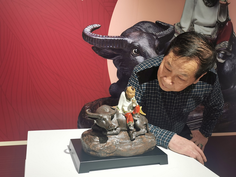 这便是素有“石湾鬼才”之称的潘柏林为牛年创作的石湾陶塑新作《闲情乐》。这次展览也是潘柏林为辛丑年创作的生肖陶塑“首秀”。