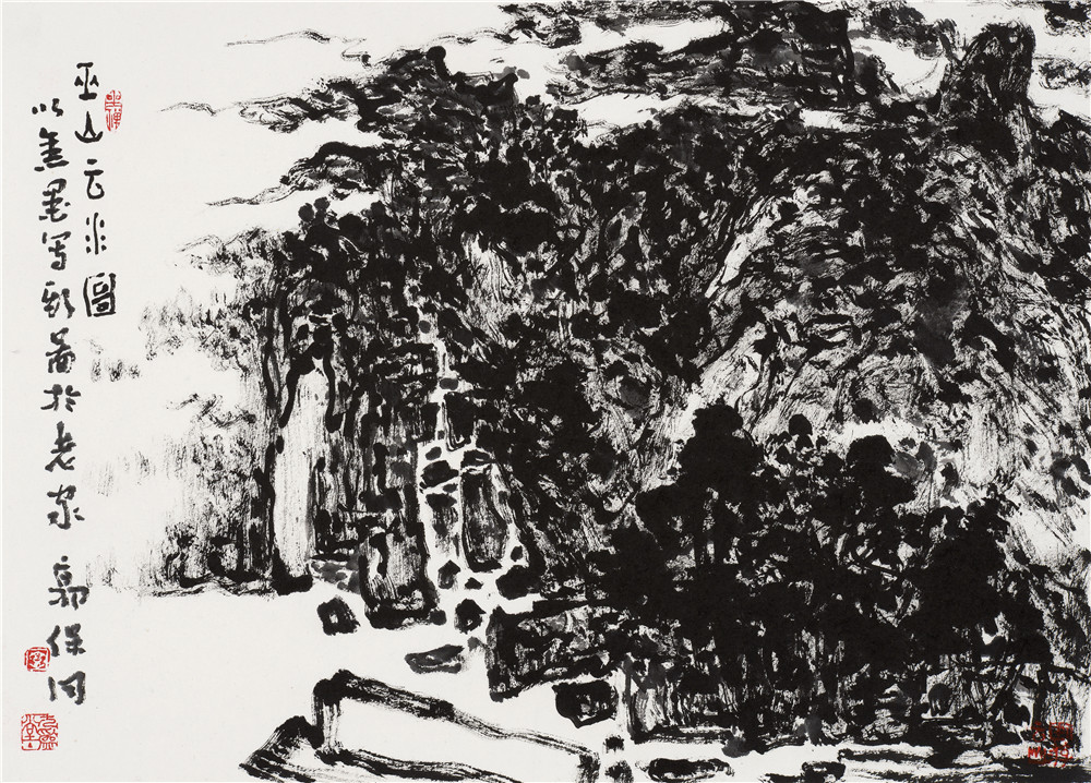 髡残的画,笔墨高古苍莽,绝无世俗气,用笔苍劲老辣,气势夺人如龙行空、虎踞岩,无任何功利之心,真正达到了“点画无奇但率真”。他的画无论是浓焦墨还是淡干墨,无论是实实在在的长线,还是时断时续,虚虚掩掩的渴笔短线,无论是屋舍人物的勾勒,还是提醒收拾的点苔,甚至皴擦勾染中都是踏实的中锋用笔,他的线内敛含蓄,柔中带刚,重提按,讲节奏,很慢、很毛、很厚、很拙、很圆,充满了坚实厚重,生辣幽雅,斑驳,宁静而又空灵的金石味道,有移山扛鼎之力。这一方面得力于他师造化常住在南京牛首山一带写生的地貌有关,另一方面源于他长期的参禅悟道和对书法金石篆刻的研究和领悟。