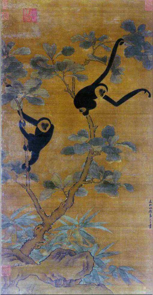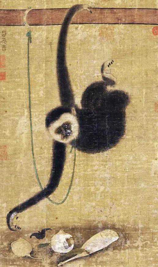 北宋易元吉《猿猴摘果图》,《蛛网攫猿图》,《三猿得鹭图》,《猿鹿图》,《乔柯猿挂图》(传),《树上二猿图》,《缚猴窃果图》,《猴猫图》(传),《聚猿》(传)。