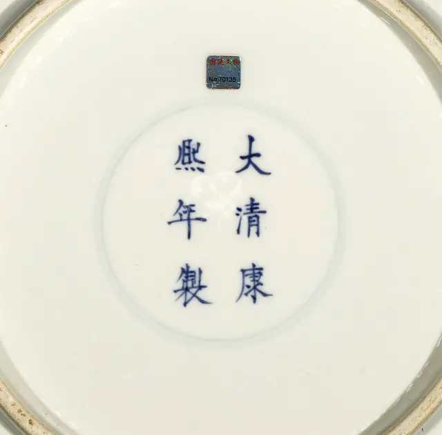 此素三彩龙凤纹棱口盘,匠人先于素胎盘内刻绘龙凤纹,灵动逼真,并以钴青书康熙年制款,仅器底施以透明釉,先经高温窑烧,后于素烧区域涂奶白色不透明釉,以深棕绘龙凤纹、折枝花卉轮廓,填以各色彩料,再经二次低温窑烧,方可成器,且体量如此巨大而无开裂变形,极为不易,也可见彼时窑工烧造工艺之精。