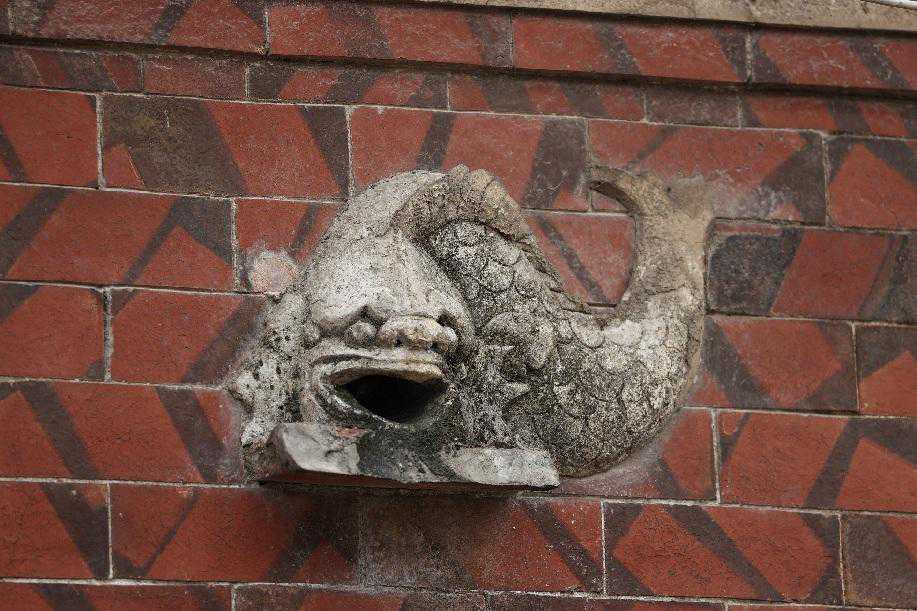 闽南红砖墙上的狮头鱼身石灰塑像(陈英杰摄)