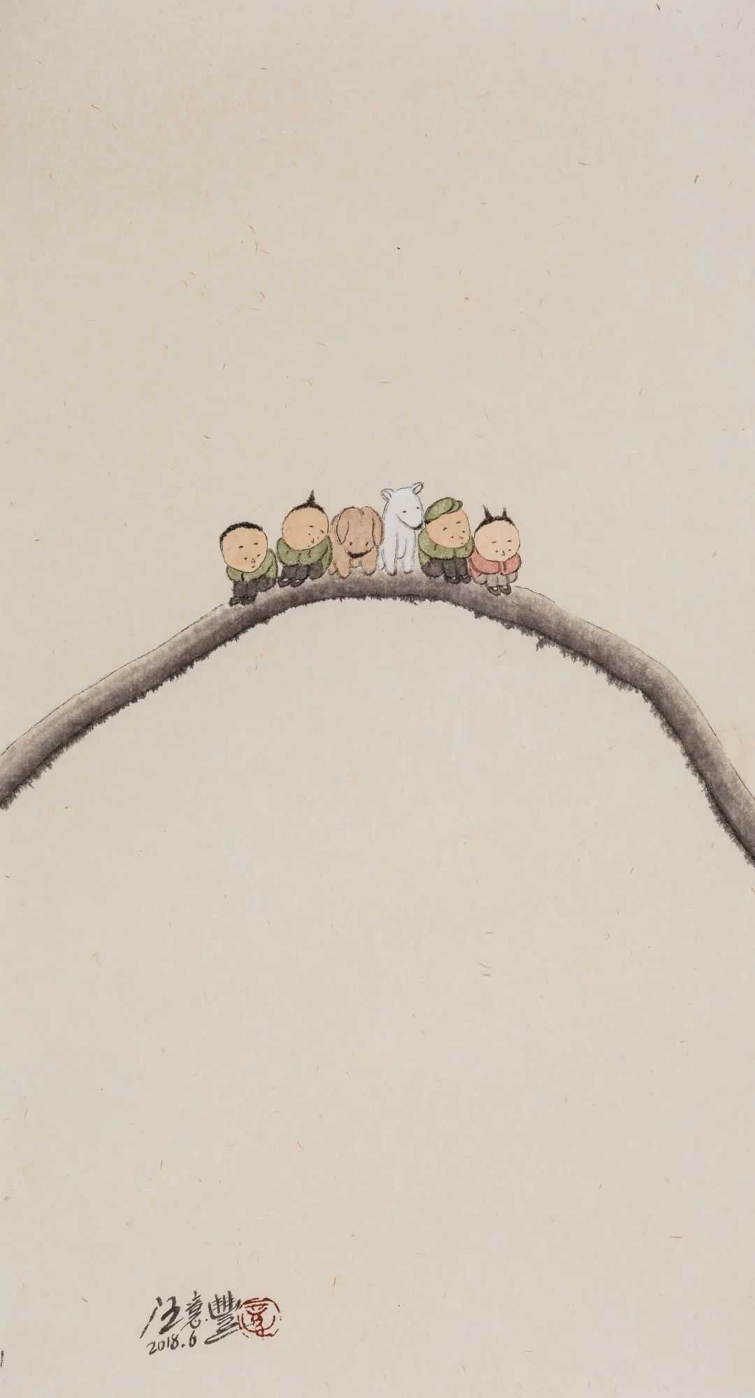 “求真性情”,指的是对客体物象的真切认识和提炼,同时也是主体情感的真实流露与抒发。汪意丰创作的《杆儿画》系列,就是他与自己的深刻对话,他把穿着各异的人与各式各样的物体放置在杆儿上,人物在杆上儿聊天,在杆儿上睡觉,在杆上儿乘车,可爱至极又富想象力。